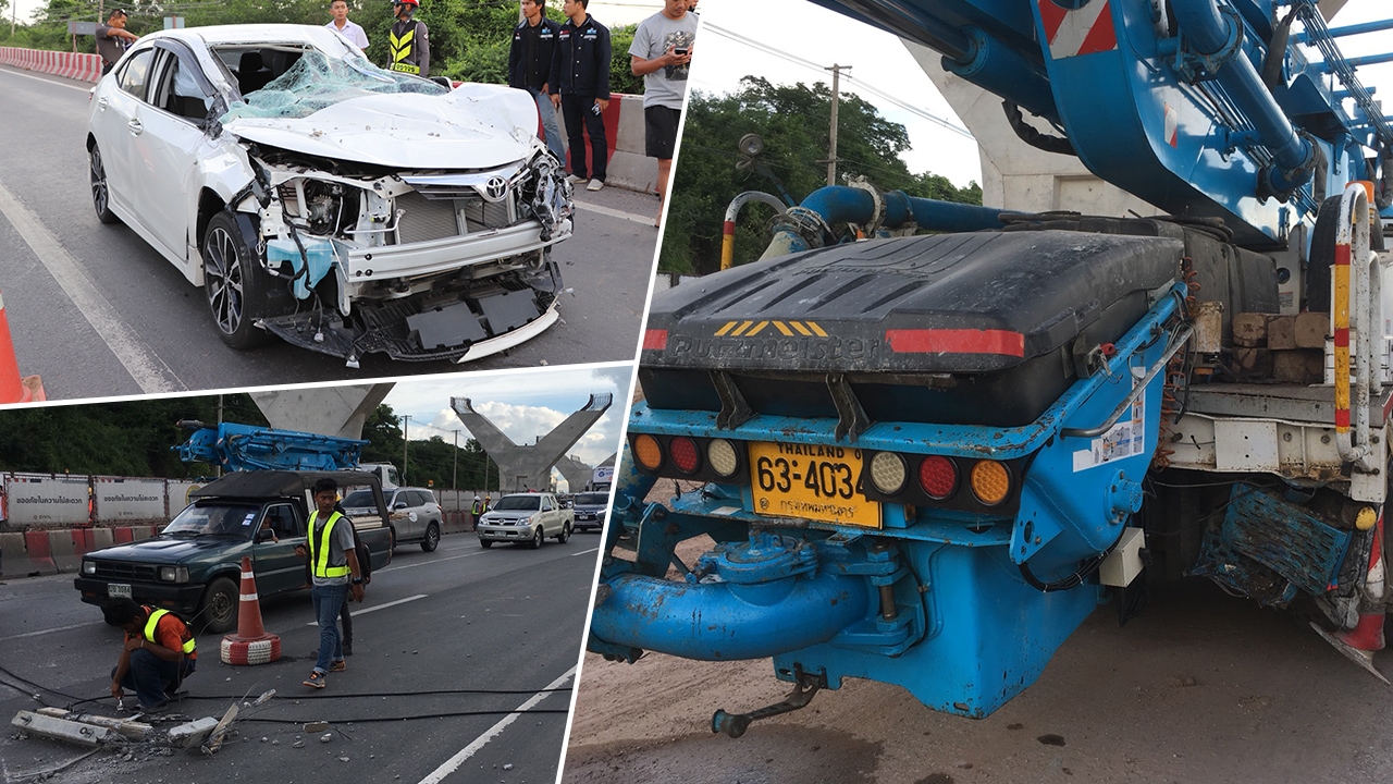 รถโม่ปูน ก่อสร้างถนนมอเตอร์เวย์ ช่วงทางยกระดับ ริมอ่างลำตะคอง ถอยชนเสาไฟฟ้า ทำให้คานปูนบนเสาไฟหล่นใส่รถเก๋งที่วิ่งตามมาพังยับ คนในรถบาดเจ็บ 2 ราย...