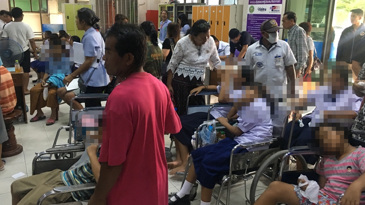 ขณะเดียวกันผู้สื่อข่าวเดินทางไปที่โรงพยาบาลยโสธรพบเด็กนักเรียนจำนวนมากอยู่ในความดูแลของแพทย์เนื่องจากเด็กบางรายมีอาการปวดท้องอย่างรุนแรง อาเจียน และเหนื่อยอ่อนเพลีย ซึ่งบางรายต้องให้นำ้เกลือ ขณะเดียวกันทาง รพ.ปฏิเสธที่จะให้ข้อมูลกับผู้สื่อข่าวพร้อมทั้งไล่ผู้สื่อข่าวออกจากห้องโถงของโรงพยาบาลอีกด้วย