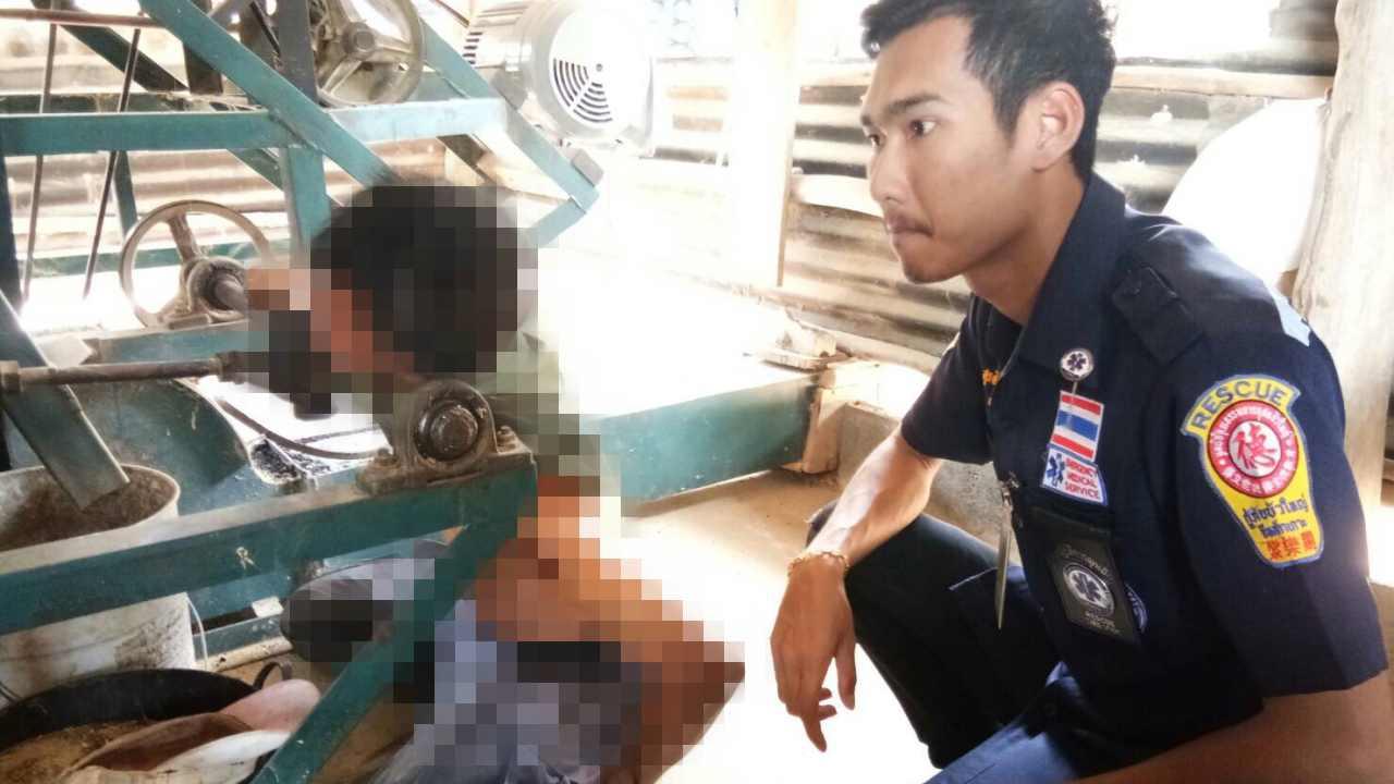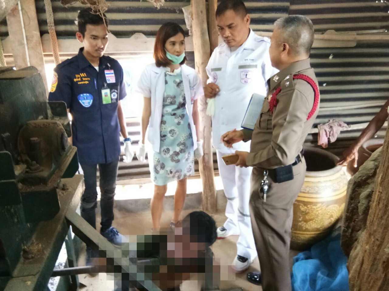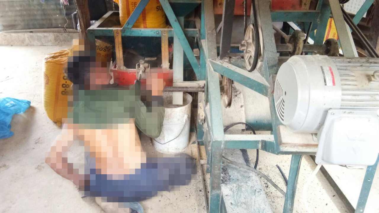 สลด ชาวนาที่บัวใหญ่ มีเครื่องสีข้าวขนาดเล็กไว้รับจ้างสีข้าว โชคร้ายขณะไปเปิดเครื่องถูกเพลาหมุนชายเสื้อเข้าไปติด รัดคอดิ้นไม่หลุด ขาดใจตายอนาถ