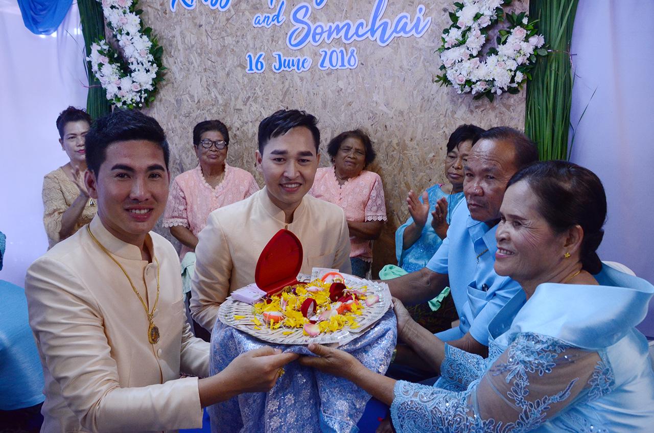 ขณะที่คู่บ่าวสาวเปิดใจว่า ฝ่ายเจ้าบ่าว คือ นายสมชาย ทำงานอยู่ที่ร้านเดอะฟลาวเวอร์ควีน ในตัวเมืองชลบุรี ซึ่งเป็นร้านรับจัดดอกไม้ในงานมงคล และยังรับเป็นพิธีกรงานต่างๆ ส่วนเจ้าสาว คือ นายกฤษณพงษ์ หรือ ปาล์ม ทำงานเป็นพยาบาลวิชาชีพ ที่โรงพยาบาลพานทอง อ.พานทอง จ.ชลบุรี ทั้งคู่รู้จักกันทางอินสตาแกรม โดยคุยกันมา 1 ปี หลังจากนั้นจึงเจอตัวจริงกันในงานอีเวนต์แห่งหนึ่ง จากนั้นก็คบหากันเรื่อยมา จนครบ 4 ปี เมื่อวันที่ 9 ก.พ.ที่ผ่านมา เจ้าบ่าวจึงเป็นฝ่ายขอแต่งงาน เจ้าสาวก็ตกลงทันที จึงได้ไปหาฤกษ์แต่งงาน โดยทั้งคู่สัญญาว่าจะรักกันเหมือนเดิม เพิ่มเติมคือความดีต่อกัน และจะอยู่คู่กันตลอดไป