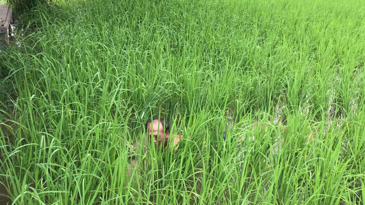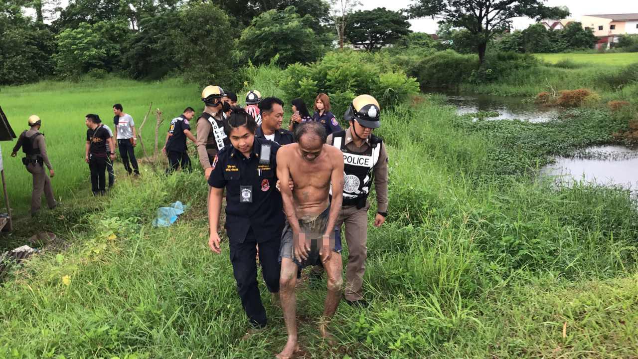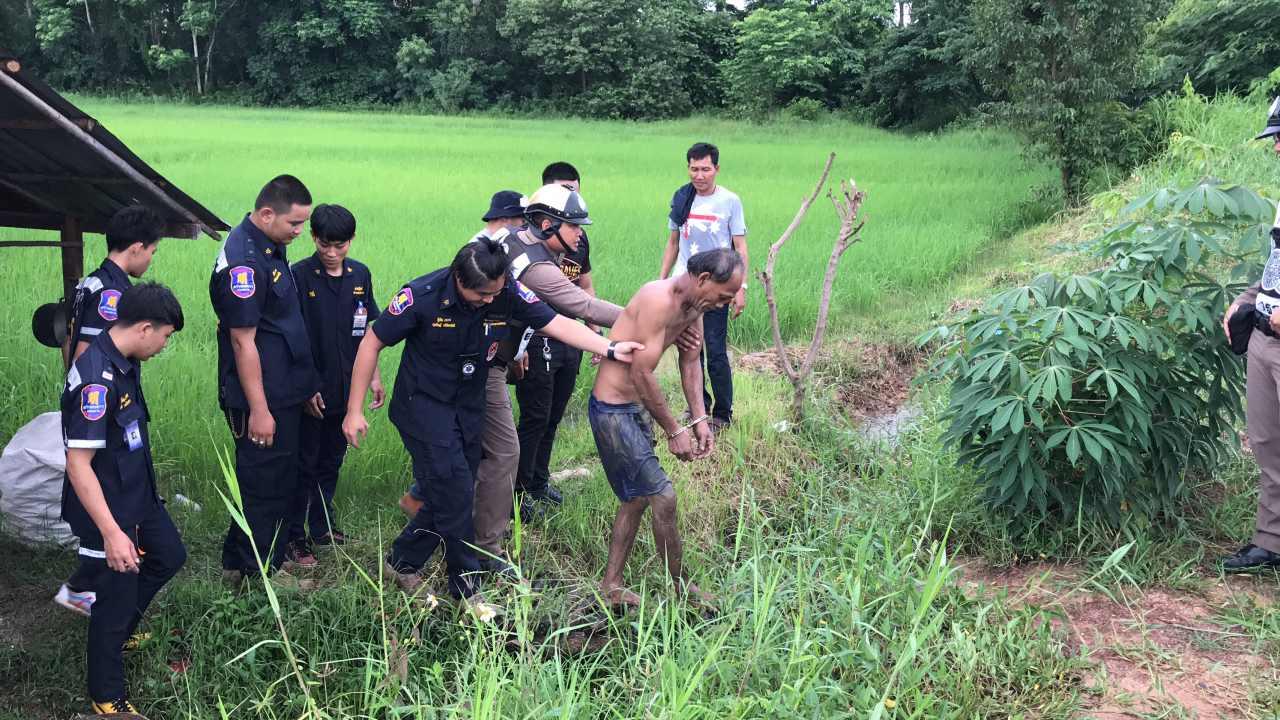 พบว่าบ้านเกิดเหตุอยู่ใกล้กับทุ่งนาและมีคลองน้ำ มีการตระเวนตามหาทั้งทางบกทางน้ำ จนไปถึงใต้ต้นไม้ใหญ่ใกล้คลองน้ำ พบรถจักรยานยนต์ฮอนด้าเวฟ สีแดง จอดอยู่ มีเสื้อและคีมตัดลวดวางไว้อยู่ด้วย คาดว่าจะเป็นของคนร้าย เมื่อสำรวจโดยรอบก็พบความผิดปกติคล้ายมีคนซ่อนอยู่ในทุ่งนา โดยเฉพาะส่วนศีรษะที่ล้านเลี่ยนทำให้สังเกตเห็นได้ชัด จึงไปตรวจดูก็พบผู้ต้องสงสัยหลบซ่อนอยู่