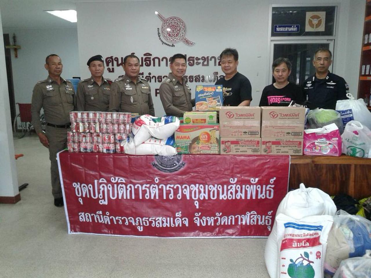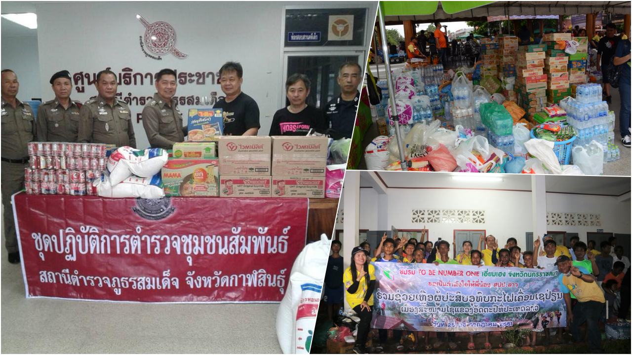 ที่ จ.กาฬสินธุ์ พ.ต.อ.ทวีศ้กดิ์ รักษาศิลป์ ผกก.สภ.สมเด็จ พร้อมด้วยข้าราชการตำรวจ สภ.สมเด็จ และกลุ่มพ่อค้า ประชาชน อำเภอสมเด็จ ร่วมกันมอบสิ่งของต่างๆ เช่นข้าวสาร บะหมี่กึ่งสำเร็จรูป ปลากระป๋อง นม เสื้อผ้า เครื่องนุ่งห่มกันหนาว เพื่อนำไปช่วยเหลือผู้ประสบอุทกภัยในประเทศลาว (สปป.ลาว) โดยได้เปิดจุดรับสิ่งของบริจาคเพื่อนำไปช่วยเหลือผู้ประสบอุกทกภัยฝั่งประเทศเพื่อนบ้าน สปป.ลาว เป็นการช่วยเหลือจากพ่อค้า ประชาชน ในเขตพื้นที่อำเภอสมเด็จ ซึ่งสิ่งของที่ได้รับมอบมาก็จะเร่งนำไปช่วยเหลือโดยเร็ว