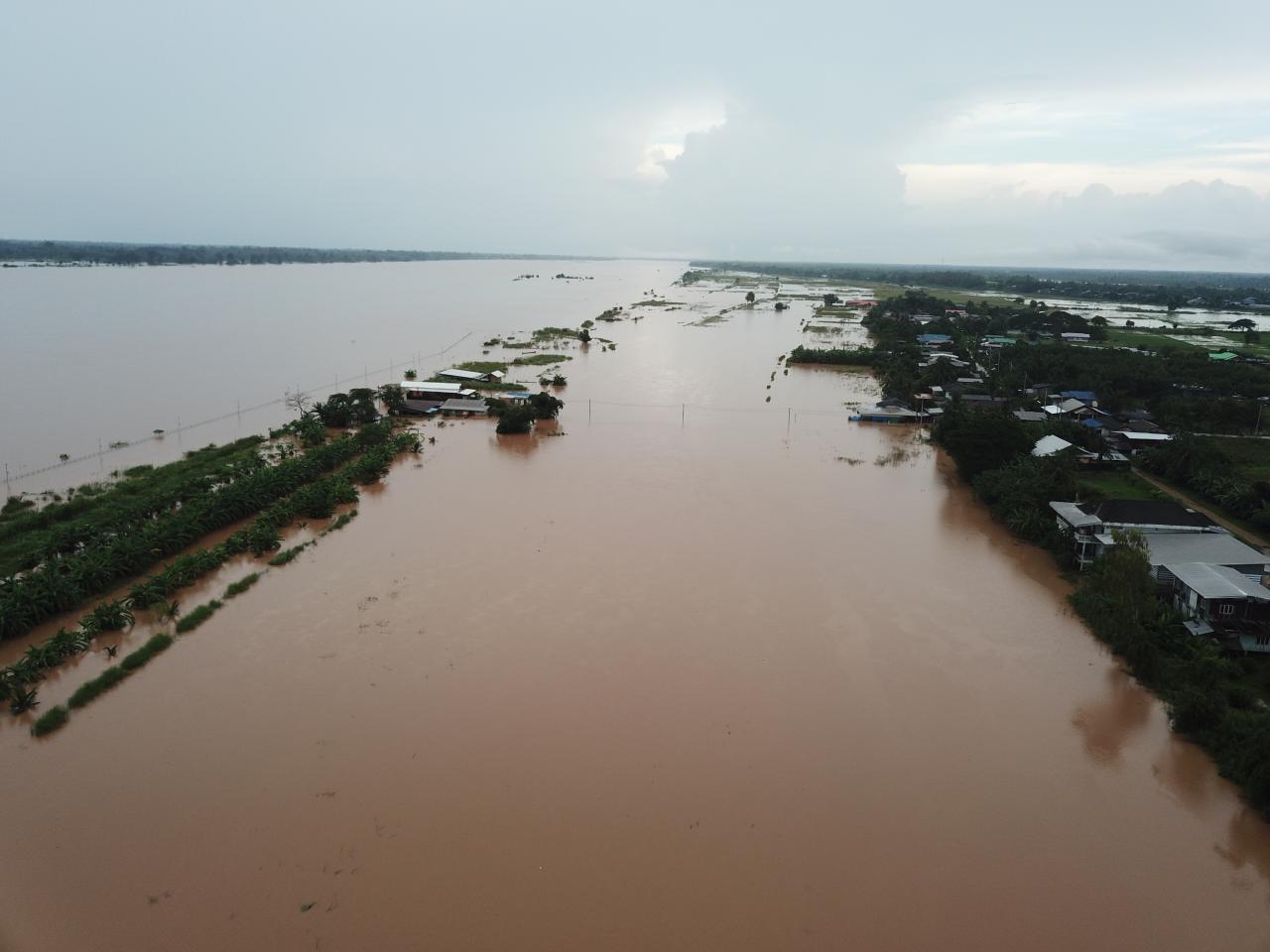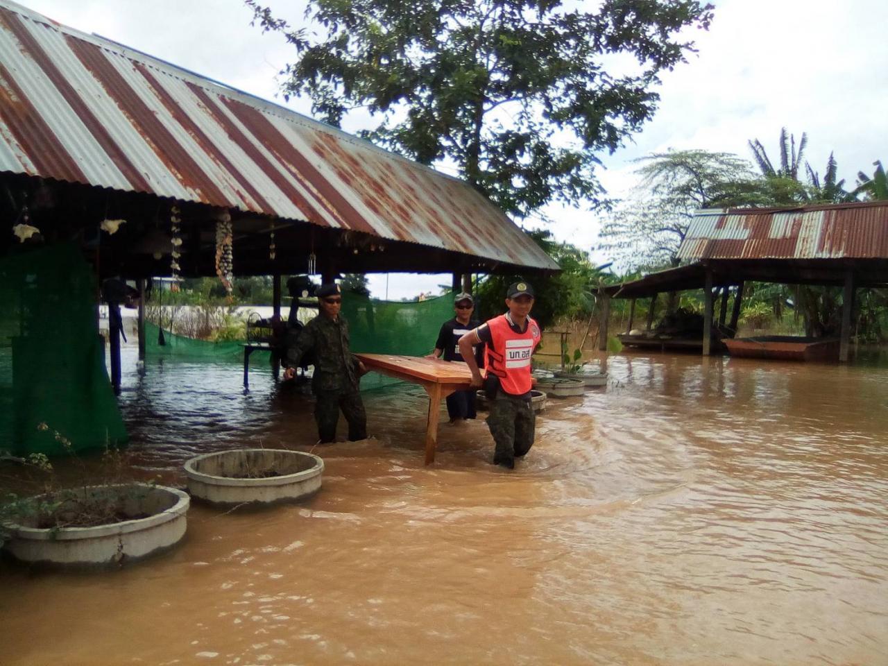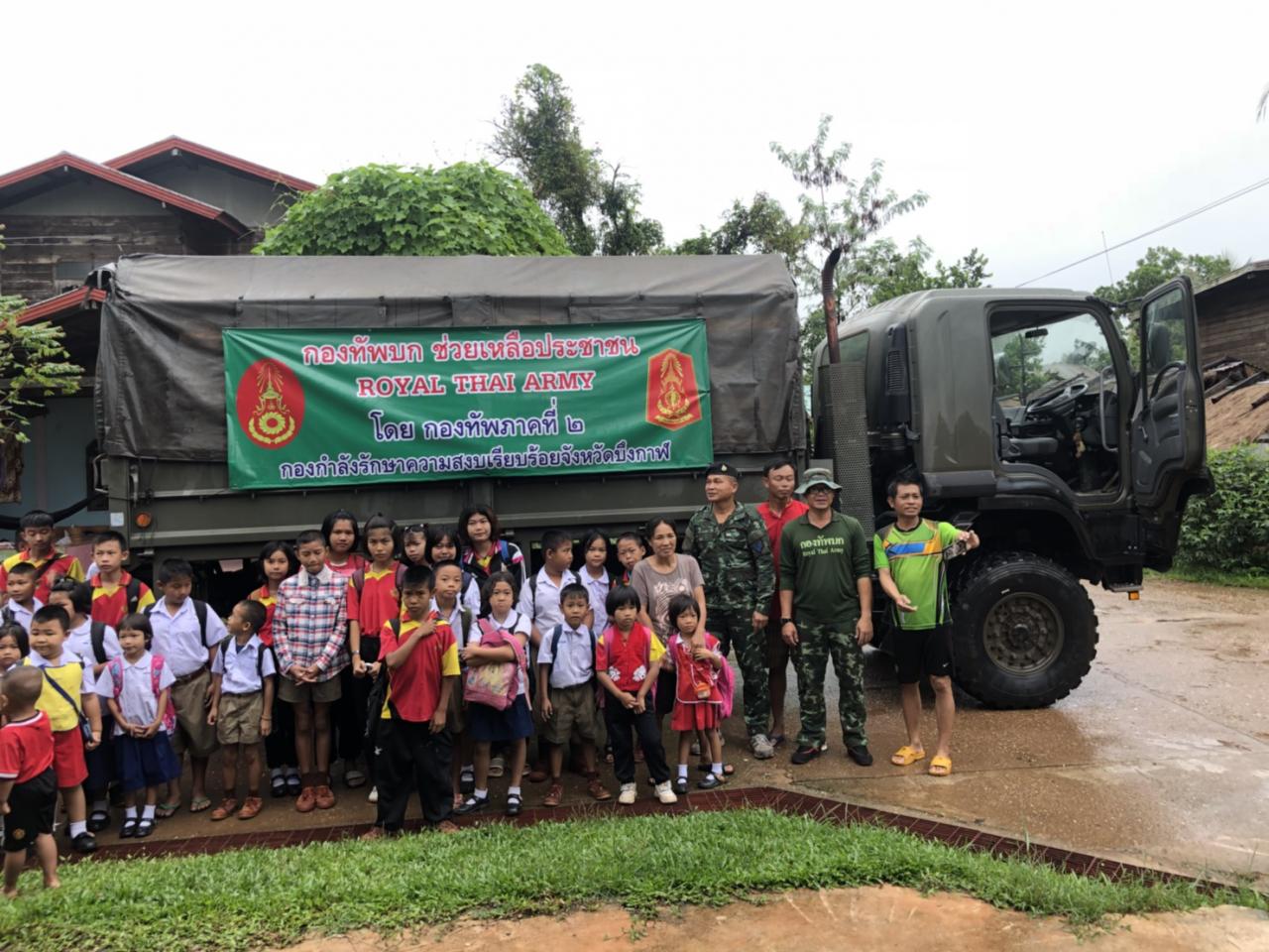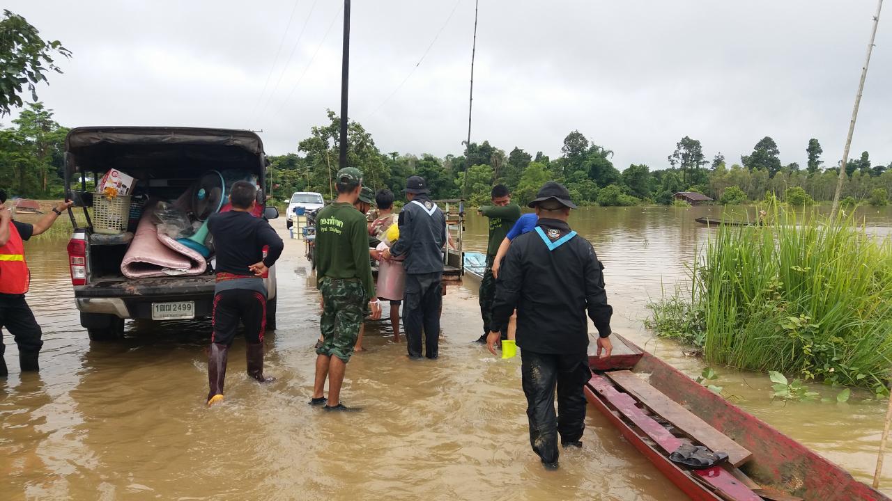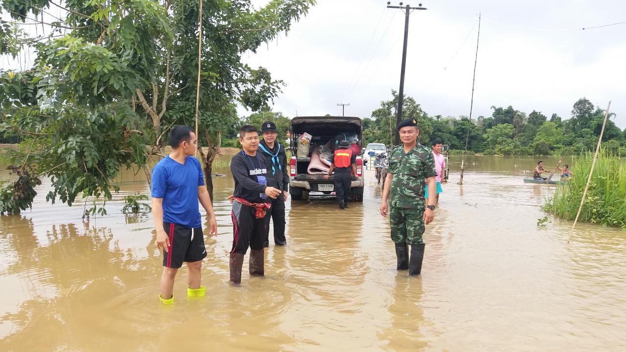 เมื่อเวลา 07.30 น. วันที่ 22 ส.ค.61 ผู้สื่อข่าวว่า สถานการณ์น้ำโขงใน จ.บึงกาฬ เช้าวันนี้ระดับน้ำในแม่น้ำโขงได้เพิ่มสูงขึ้นอีก โดยวัดได้ 13.25 เมตร (ระดับน้ำเพิ่มขึ้นจากวานนี้ 10 ซม.) ห่างจากระดับตลิ่ง 1.75 ม. ห่างจากจุดวิกฤติ 0.75 ม. ส่งผลให้มีน้ำจำนวนมากหนุนลำน้ำสาขา ประกอบกับมีฝนตกลงมาอย่างต่อเนื่อง น้ำเอ่อล้นท่วมพื้นที่หลายอำเภอของจังหวัดบึงกาฬ โดนเฉพาะที่บ้านเทพมีชัย ม.7 ต.หนองเดิ่น อ.บุ่งคล้า จ.บึงกาฬ ระดับที่เพิ่มสูงประกอบกับมีมวลน้ำสะสมจากภูวัว และภูสิงห์ ไหลลงมาสมทบ ทำให้น้ำท่วมถนนทางเข้าหมู่บ้าน ระดับน้ำสูง 80 ซม.-1 เมตร ระยะทางยาวกว่า 300 เมตร รถเล็กไม่สามารถสัญจรผ่านไปมาได้ ทหารรักษาความสงบเรียบร้อยจังหวัดบึงกาฬ ต้องนำรถบรรทุกทางทหารขนาดใหญ่ รับ-ส่ง เด็กๆ จากในหมู่บ้านมาส่งที่โรงเรียน พร้อมจัดรถรับส่งชาวบ้านที่จะเข้าออกหมู่บ้าน อำนวยความสะดวก ตลอดทั้งวัน ส่วนในพื้นที่อำเภอเมืองบึงกาฬ ทหารเข้าช่วยเหลือขนย้ายทรัพย์สินสิ่งของมีค่าบ้านเรือนประชาชนที่ประสบอุทกภัย