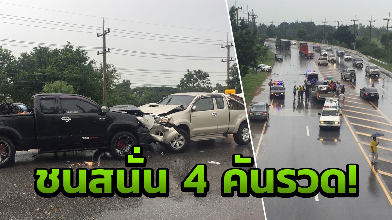 กระบะซิ่งฝ่าสายฝน ลื่นเสียหลักพุ่งข้ามชนซ้ำซ้อนยับ 4 คันรวด ถนนสาย 201 ชัยภูมิ-สิ้ว รถพังเกลื่อนถนน เจ็บสาหัส 3 ราย