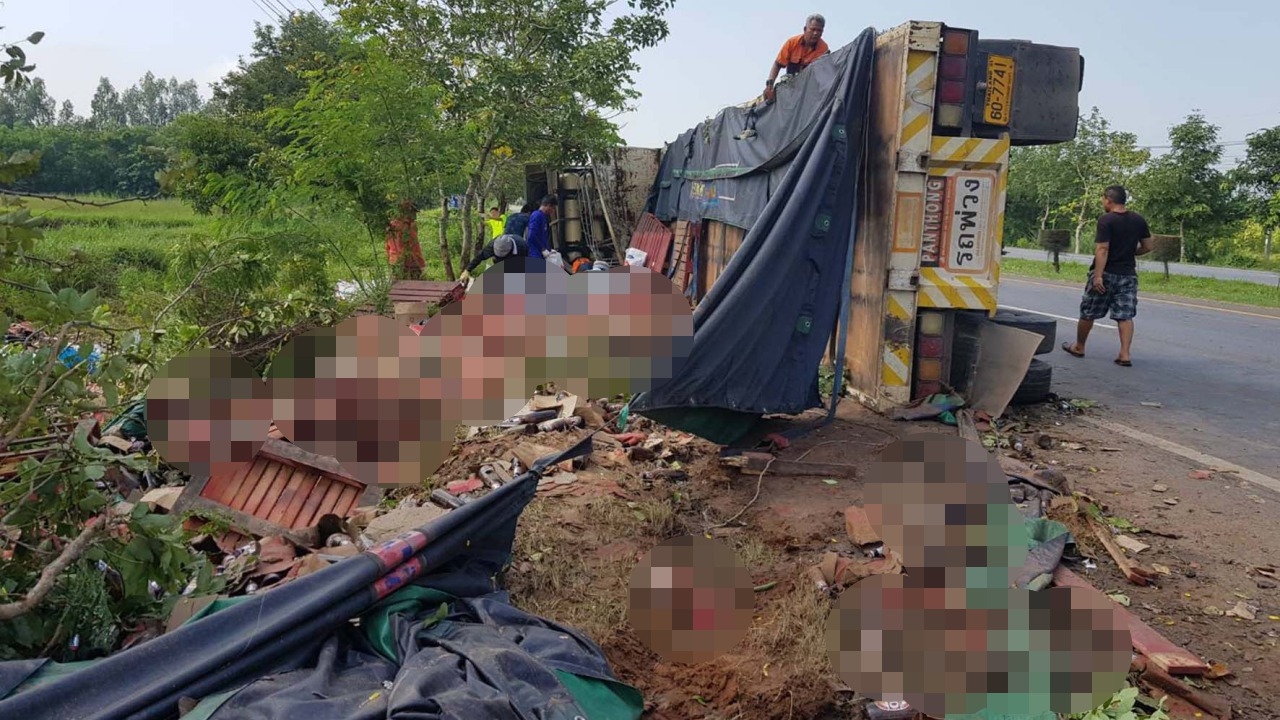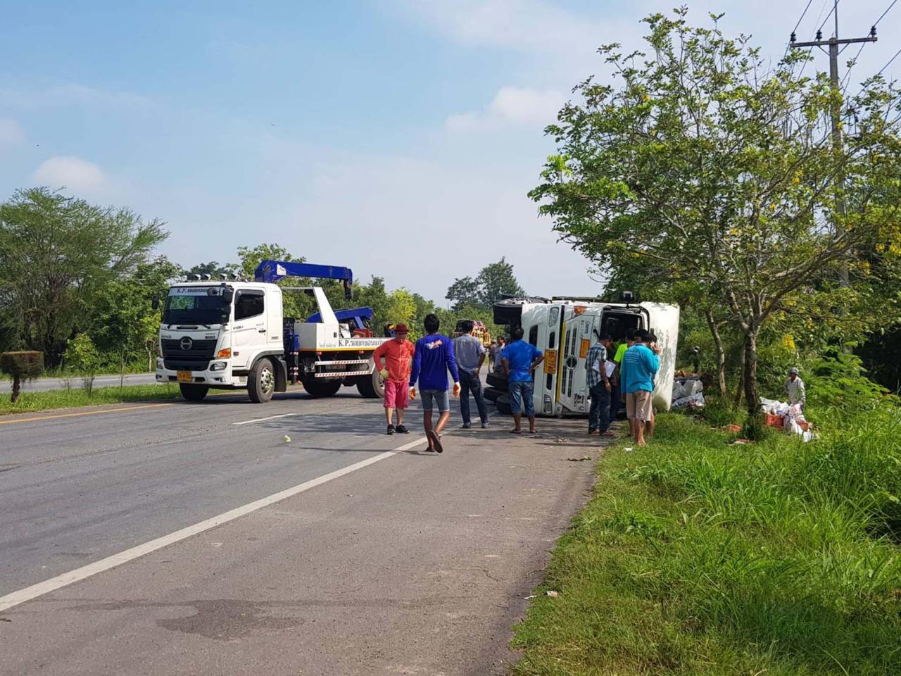 รถพ่วงบรรทุกเครื่องดื่มแอลกอฮอล์ เกิดพลิกคว่ำเทกระจาดบนถนนมิตรภาพ พื้นที่บ้านโนนกล้วยหอม จ.ขอนแก่น ทำให้ลังบรรจุเครื่องดื่มตกแตกเกลื่อนพื้นเหม็นคลุ้ง ตร.เผยคนขับหลับใน...