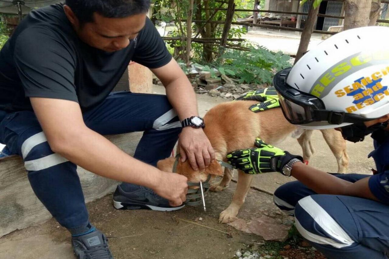 เมื่อไปถึงพบสุนัขเพศผู้ อายุประมาณ 3 ปี สีน้ำตาล ถูกยิงด้วยลูกดอกยิงปลา ยาว 1 ฟุต เข้าที่ระหว่างเหนือตาและใบหูด้านซ้าย เจาะกะโหลก บาดเจ็บสาหัส อาการปางตาย กู้ภัยฯ รีบปฐมพยาบาลเบื้องต้น ก่อนนำส่งโรงพยาบาลสัตว์เลย เพื่อช่วยเหลือนำลูกดอกออกมา โดยมี นางสาวทองพูน พิมพะจักร อายุ 38 ปี เจ้าของสุนัข ยืนดูด้วยอาการตกใจ