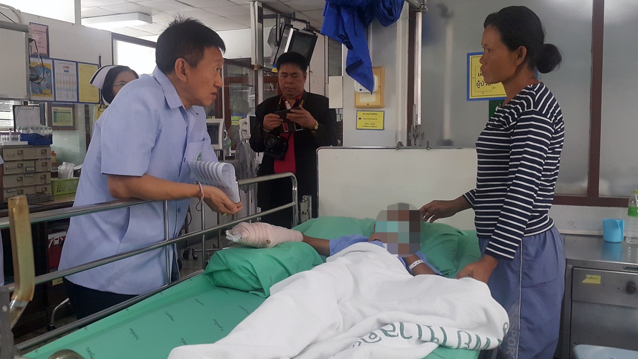 เมื่อเวลา 14.30 น. วันที่ 11 ตุลาคม 2561 ที่ตึกรวมเมตตาธรรม 2 (ชาย) โรงพยาบาลศูนย์อุดรธานี นพ.ณรงค์ ธาดาเดช ผอ.โรงพยาบาลศูนย์อุดรธานี เดินทางเข้าเยี่ยมสอบถามอาการ ด.ช.นลธวัช หรือน้องต้นหลิว มารศรี อายุ 10 ขวบ นักเรียนชั้น ป.5 โรงเรียนบ้านฝาง ต.โพนสูง อ.บ้านดุง จ.อุดรธานี ได้รับบาดเจ็บจากการเล่น “ประทัด” ถูกส่งตัวจาก รพ.บ้านดุง เข้ารับการผ่าตัดนิ้วและมือขวา นอนพักรักษาตัวอยู่รอดูอาการ โดยมี นพ.สมควร ภารถีรุจิรา เป็นแพทย์รักษา