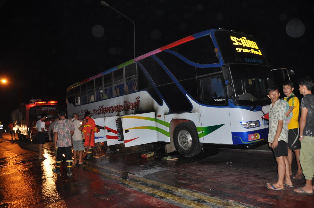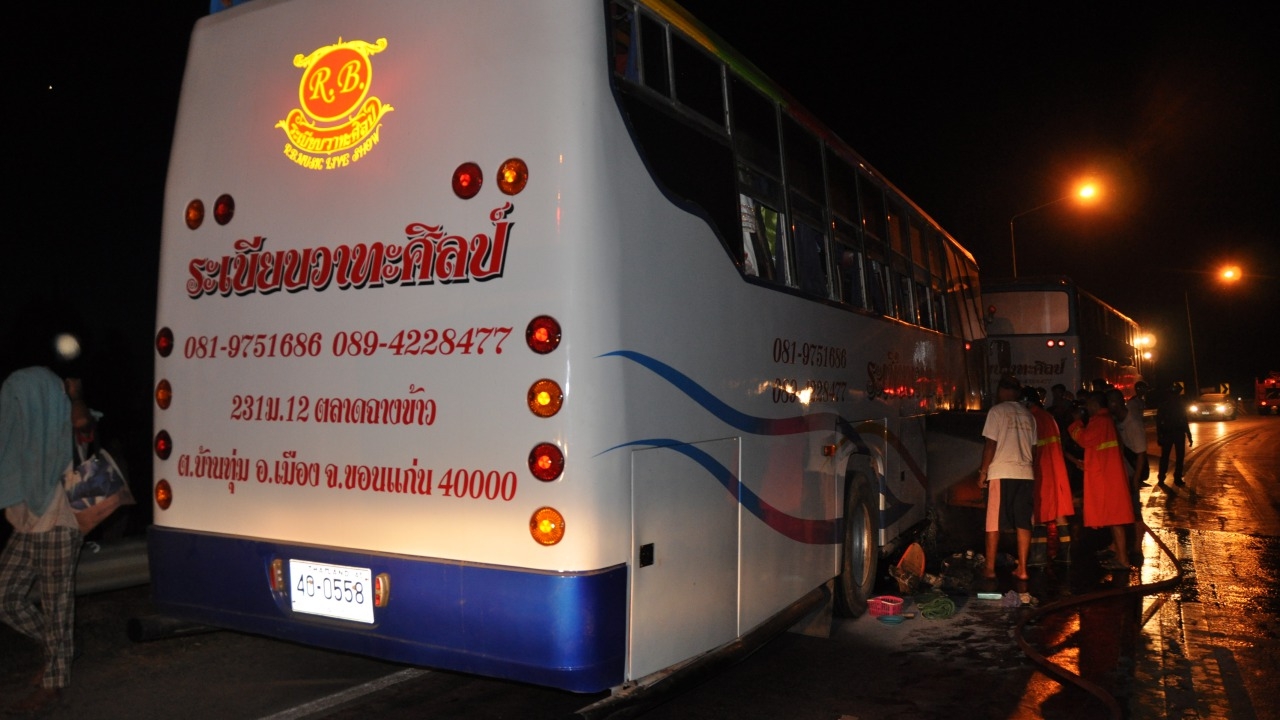 จากการตรวจสอบพบว่า เป็นรถบัสสีฟ้าขาว ทะเบียน 40-0558 ขอนแก่น ของคณะหมอลำระเบียบวาทะศิลป์ หมอลำชื่อดังของภาคอีสาน และพบว่านักแสดงลงจากรถหมดแล้ว มีชุดการแสดงและสิ่งของเครื่องใช้บางส่วนถูกไฟไหม้ได้รับความเสียหาย แต่ไม่มีผู้ใดได้รับบาดเจ็บ ที่ใต้ท้องรถบริเวณที่ใช้เก็บของซึ่งมีท่อไอเสียรถอยู่มีรอยไหม้ จากการที่ท่อไอเสียเกิดความร้อนแล้วเกิดประกายไฟลุกไหม้กล่องกระดาษเก็บชุดการแสดงที่ตั้งอยู่ติดกับท่อไอเสีย จนทำให้เกิดเหตุไฟไหม้ในครั้งนี้
