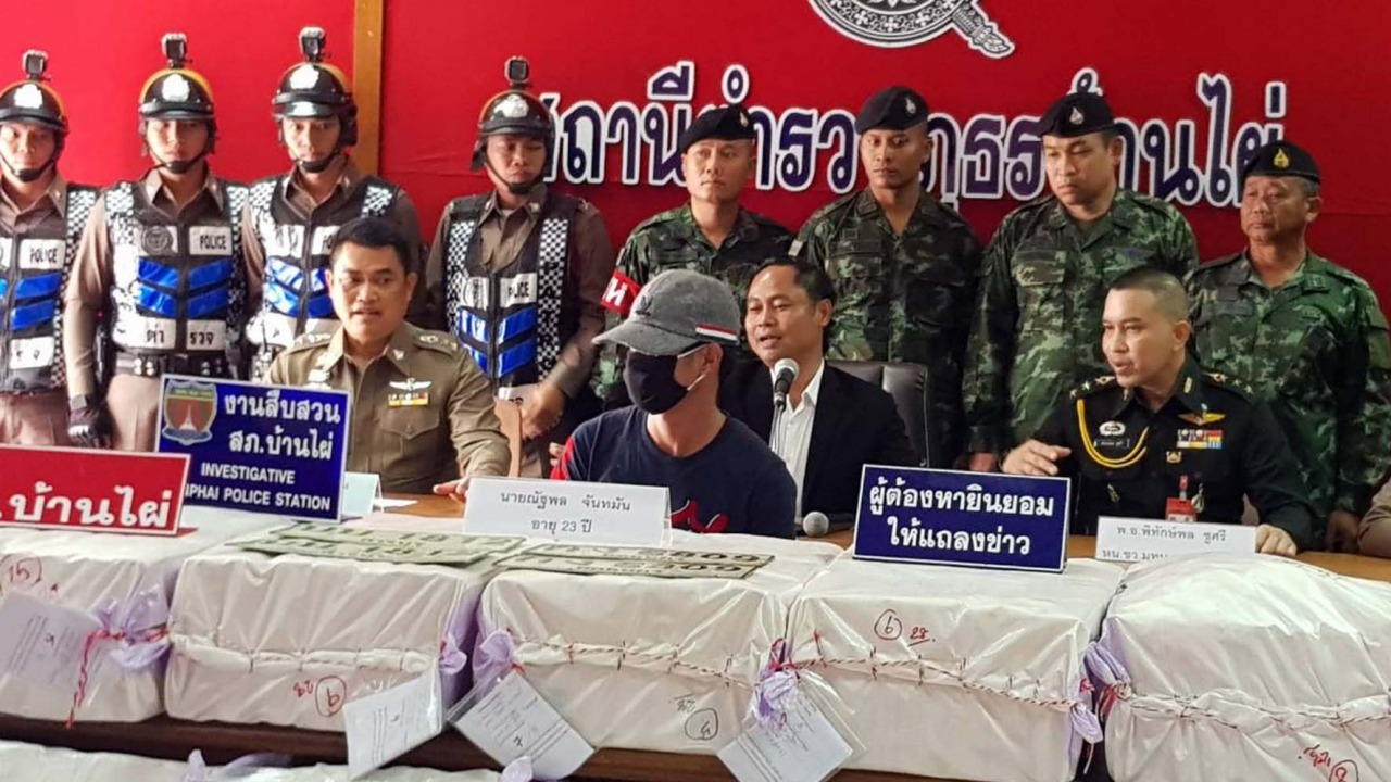 เมื่อเวลา 11.30 น. วันที่ 27 พฤศจิกายน 2561 ที่ห้องประชุม สภ.บ้านไผ่ จ.ขอนแก่น นายรุจ รังสี นายอำเภอบ้านไผ่ จ.ขอนแก่น พ.ต.อ.จำรัส จันแดง ผกก.สภ.บ้านไผ่ จ.ขอนแก่น พ.อ.พิทักษ์พล ชูศรี หัวหน้าฝ่ายข่าว กกล.รส.ขอนแก่น พร้อมเจ้าหน้าที่ 3 ฝ่าย ร่วมกันแถลงข่าวการจับกุมผู้ต้องหาในคดียาเสพติดกัญชาแท่งอัดแห้ง โดย นายณัฐพล(นัด) จันทมัน อายุ 30 ปี ชาวบ้าน ม.2 ต.อรัญญิก อ.เมือง จ.พิษณุโลก ผู้ต้องหายินยอมให้แถลงข่าว