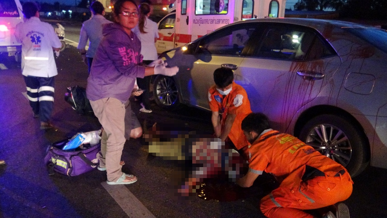 เมื่อไปถึงเป็นจุดกลับรถและเป็นทางโค้งเล็กน้อย พบรถเก๋งยี่ห้อโตโยต้า รุ่นอัลติส สีบรอนซ์เงิน ทะเบียน 3 กฆ-7231 กรุงเทพมหานคร จอดอยู่กลางถนนในสภาพด้านหน้ารถฝั่งซ้ายมีร่องรอยถูกเฉี่ยวชนจนพังเสียหาย ห่างออกไปอีกประมาณ 10 เมตร พบรถจักรยานยนต์ยี่ห้อฮอนด้า สกู๊ปปี้ไอ ทะเบียน 1กจ-715 ยโสธร ล้มตะแคงอยู่ ส่วนด้านข้างรถเก๋งพบร่างของผู้หญิงนอนจมกองเลือด อยู่ในภาพหมดสติ ทราบชื่อ นางสมหมาย ภาคพรม อายุ 69 ปี เจ้าของร้านส้มตำยายหมาย อยู่บ้านเลขที่ 94/3 ถนนวารีราชเดช ต.ในเมือง อ.เมืองยโสธร เจ้าหน้าที่กู้ภัยต้องเร่งเข้าไปช่วยกันปั๊มหัวใจเพื่อฟื้นคืนชีพแต่สัญญาณชีพไม่ตอบสนองจึงนำผู้บาดเจ็บส่งไปที่โรงพยาบาลยโสธรและเสียชีวิตในเวลาต่อมา