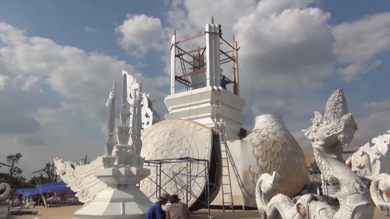 คณะทำงานใช้เครน ยกยอดฉัตร จุดสูงสุดของนกหัสดีลิงค์ ประกอบเมรุ "หลวงพ่อคูณ" ท่ามกลางลมแรง สำเร็จด้วยดี เชื่อทุกอย่างเสร็จตามแผน 19 ม.ค.นี้ ...