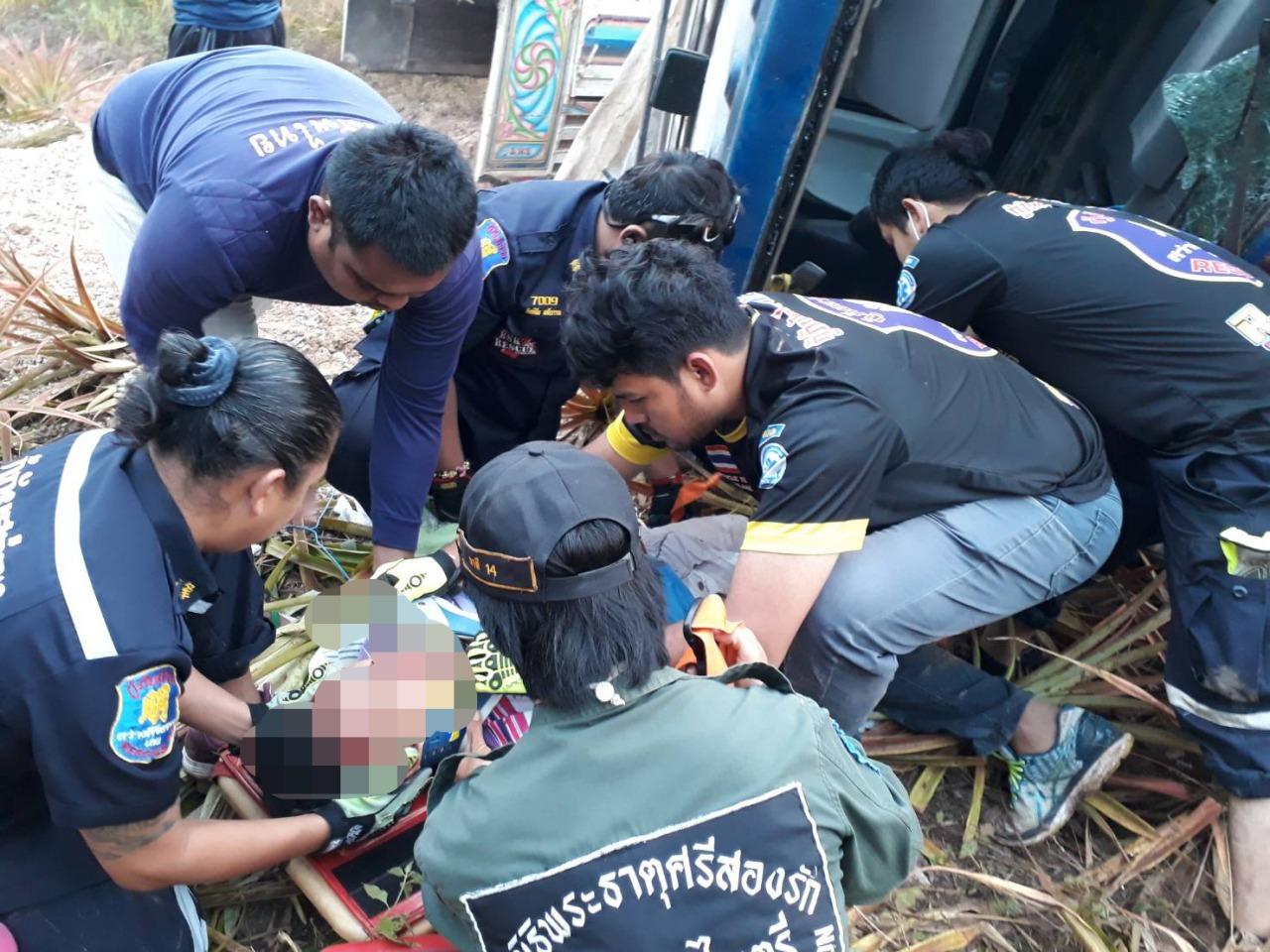 เมื่อเวลา 07.00 น. วันที่ 14 ม.ค.62 พ.ต.ท.วัฒนา จันพาลา สว.(สอบสวน) สภ.ด่านซ้าย จ.เลย ได้รับแจ้งมีเหตุรถพ่วง 18 ล้อ ลงเขาเบรกแตกพลิกคว่ำ คนขับติดอยู่ภายในรถ ที่ถนนสายบ้านปากหมัน-บ้านแก่งม่วง ต.นาดี อ.ด่านซ้าย เมื่อรับแจ้งประสานไปยังกู้ภัยสว่างคีรีธรรม กู้ภัยสัจจะไมตรี จุดด่านซ้าย พร้อมเครื่องตัดถ่างเดินทางไปที่เกิดเหตุ พบรถพ่วง 18 ล้อ บรรทุกหิน ยีห้ออีซูซุ สีขาว ทะเบียนตัวแม่ 81-8219 เลย ทะเบียนลูกพ่วง 81-8220 เลย สภาพพลิกคว่ำหงายท้องอยู่ริมทางด้านขวาถนนลงเขา หินเทกระจายไปทั่วบริเวณ พบนายโชคชัย สารมะโน อายุ 48 ปี (อดีต ส.อบต.ปากหมัน) ชาวบ้าน หมู่ 7 ต.ปากหมัน อ.ด่านซ้าย จ.เลย คนขับรถ ติดอยู่ภายในรถได้รับบาดเจ็บ กู้ภัยฯ งัดกระจกหน้ารถนำตัวออกมาสภาพบาดเจ็บหนัก นำส่ง รพ.สมเด็จพระยุพราชด่านซ้าย