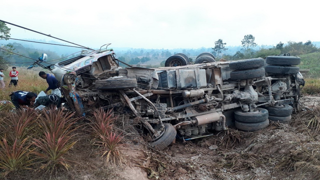 อดีตสมาชิก อบต.ขับรถพ่วง 18 ล้อบรรทุกหินลงเขาบนถนน บ้านปากหมัน-บ้านแก่งม่วง อ.ด่านซ้าย เกิดเบรกแตกเสียหลักพลิกคว่ำ เทหินที่บรรทุกมากระจายไปทั่วบริเวณบาดเจ็บสาหัส...