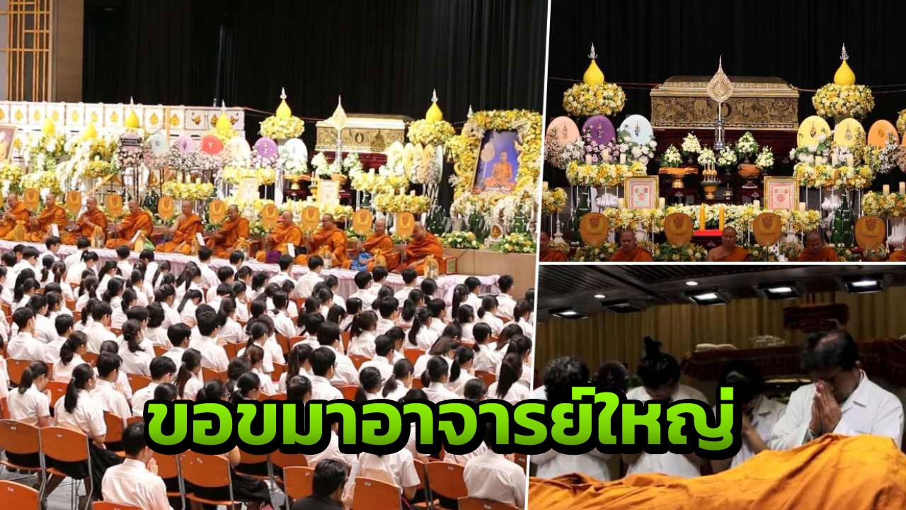 จากนั้น เข้าสู่พิธีการขอขมาครูใหญ่ โดยคณาจารย์ และนักศึกษาจากศูนย์วิทยาศาสตร์สุขภาพ มข. ซึ่งประกอบด้วย คณะแพทยศาสตร์ คณะทันตแพทยศาสตร์ คณะเทคนิคการแพทย์ คณะพยาบาลศาสตร์ คณะสาธารณสุขศาสตร์ และคณะเภสัชศาสตร์ รวมกว่า 300 คน ได้ร่วมประกอบพิธีขอขมาร่างครูใหญ่และสรีระสังขารครูใหญ่หลวงพ่อคูณ หลังการเคลื่อนย้ายสรีรสังขารหลวงพ่อคูณ และร่างครูใหญ่ ทั้ง 647 ร่างจากคณะแพทยศาสตร์ มายัง ศูนย์ประชุมอเนกประสงค์ฯ แล้วเสร็จ