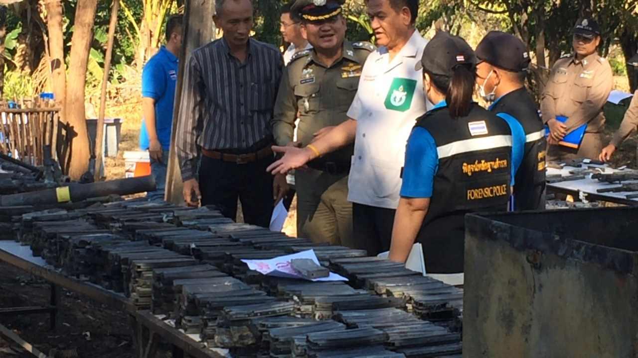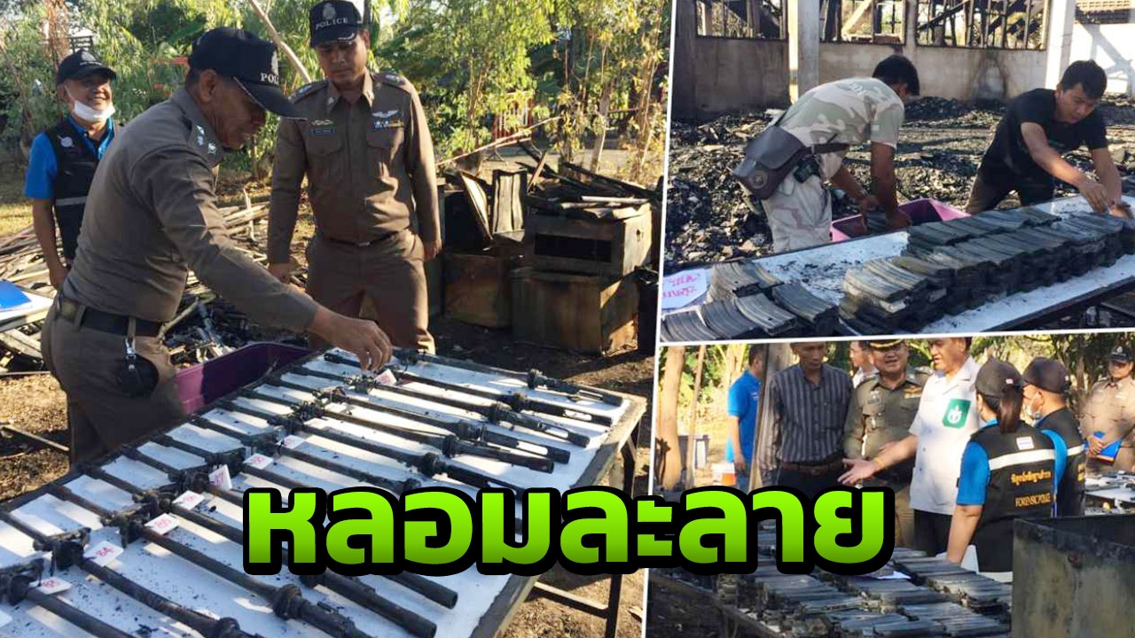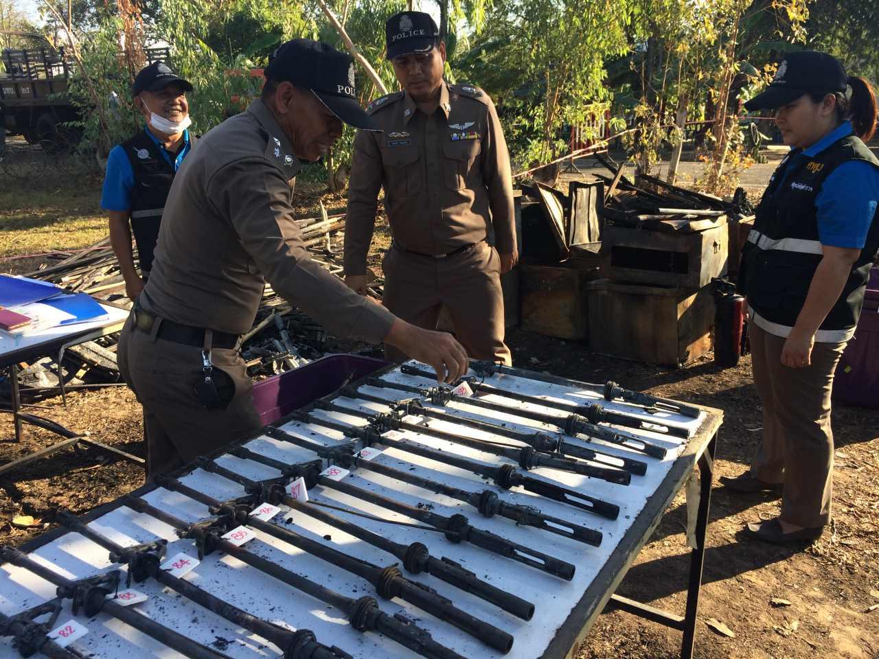 ผวจ.สุรินทร์ ตรวจที่เกิดเหตุ ไฟไหม้อาคารกองร้อยอส.วอด นำซากปืน เอ็ม16 เอ็ม79 ปืน11ม.วางเรียงพร้อมติดหมายเลข รอเจ้าหน้าที่จากกรมการปกครอง ตรวจอีกครั้ง
