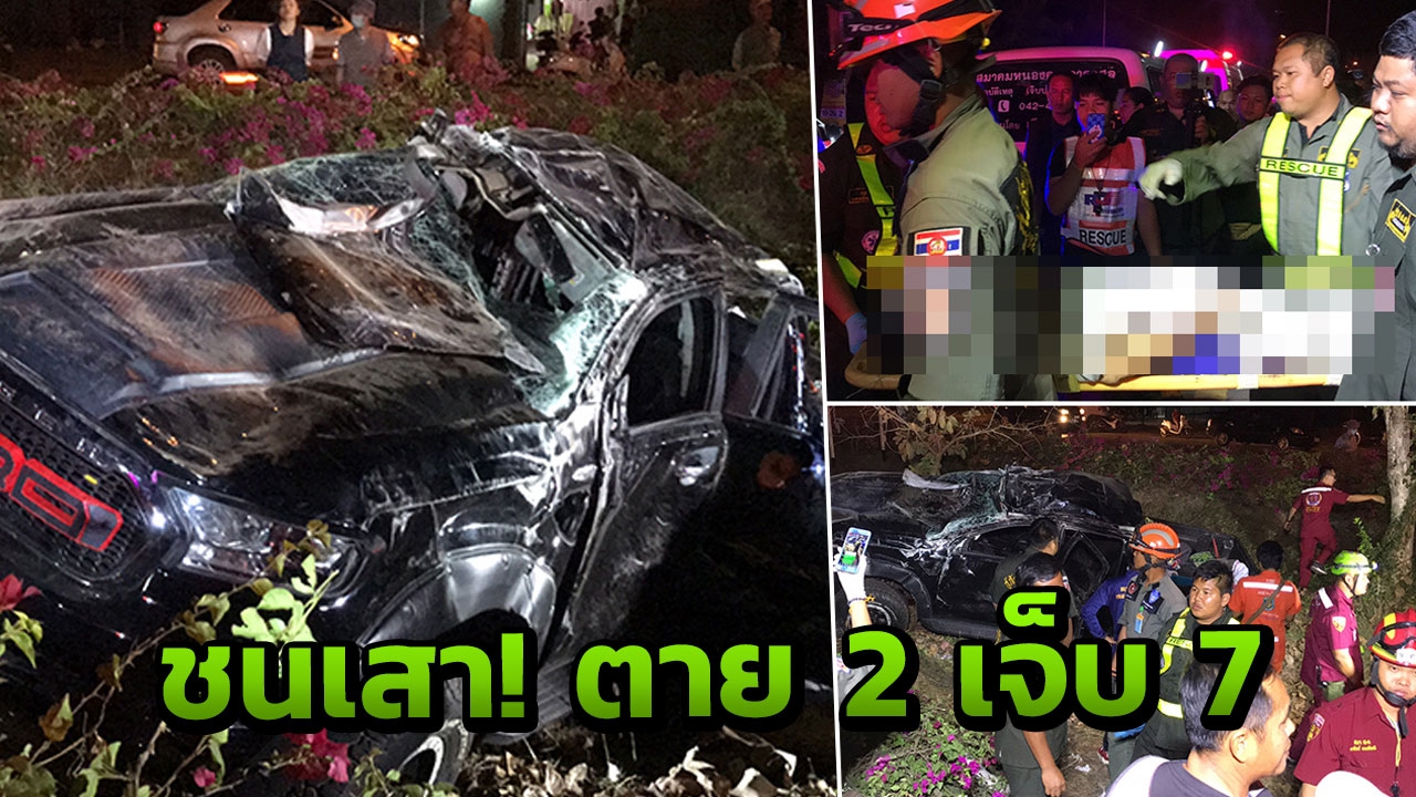 ชนสยอง ตาย 2 เจ็บอีก 7 หนุ่มซิ่งกระบะฟอร์ด 4 ประตูบรรทุกคนนั่งมาด้วยรวม 9 ชีวิต หักหลบจยย.วิ่งเลนขวา เฉี่ยวหน้ารถอีกคัน ก่อนเสียหลักพุ่งตกร่องกลางถนน ชนเสาไฟฟ้าหักสองท่อน