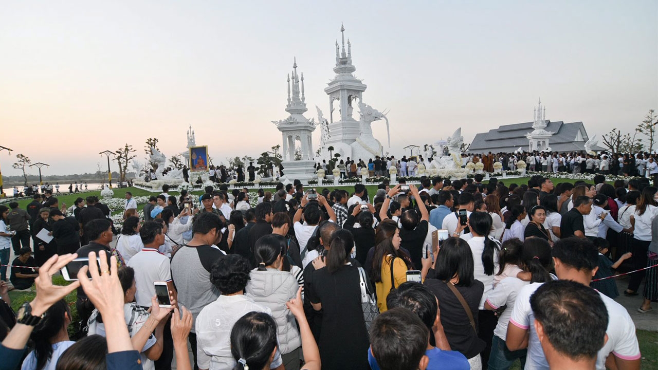ประชาชนหลายหมื่นคนเข้าเยี่ยมชม วางดอกไม้ จันทน์ และถ่ายรูปกับเมรุ ลอยนกหัสดีลิงค์เทิน บุษบก บนยอดเขาพระ สุเมรุ บริเวณฌาปนสถานชั่วคราว สถานที่ใช้ถวายเพลิงหลวงพ่อคูณ ปริสุทฺโธ บนเกาะกลางน้ำหลังพุทธมณฑลอีสาน วัดหนองแวง พระอารามหลวง ริมถนนสายเลี่ยงเมืองขอนแก่น-อุดรธานี ต.ศิลา อ.เมืองขอนแก่น.