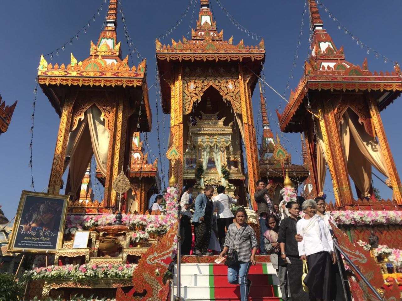 พุทธศาสนิกชนแห่ชมวัดบ้านไร่ เพื่อเข้าดูการประกอบจิตกาธานแทงหยวกที่เสร็จได้อย่างสวยงาม ขณะที่กรรมการโชว์ไอเดียใช้ลอตเตอรี่เก่าห่อวัตถุมงคลพ่อคูณเป็นดอกสอยดาวเพื่อนำเลขไปเสี่ยงโชค...