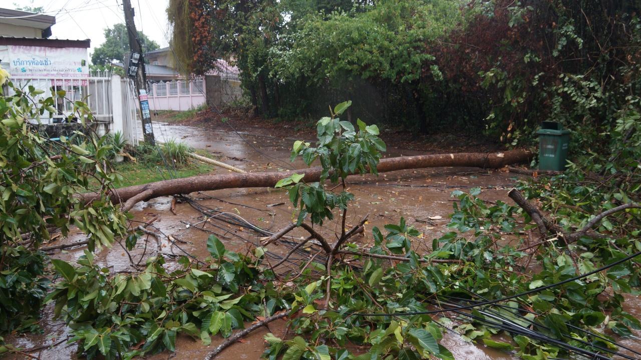 ขณะที่ ถนนทางเข้าวัดป่าธาราธรรมาวาส ต้นไม้ขนาดใหญ่ 2 ต้นหักโค่นทับสายไฟและล้มขวางถนน จนไม่สามารถสัญจรผ่านได้ ส่วนบ้านนาแกน้อย ต.ดงมะไฟ พายุพัดหลังคาบ้านเรือนประชาชนปลิวเสียหายหลายหลัง นอกจากนี้ยังพบว่ามีหม้อแปลงระเบิด ส่งผลให้ไฟดับในเขตเทศบาลนครสกลนครเป็นวงกว้าง