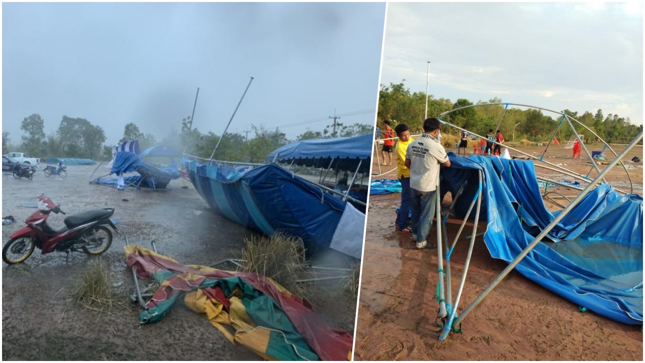 พายุฝนถล่มรุนแรงในพื้นที่ อ.นางรอง เต็นท์งานแข่งกีฬาประจำตำบล พังเสียหายปลิวว่อน ขาเหล็กกระแทกกระจกรถแตก สาวผู้ช่วยผู้ใหญ่บ้าน โชคร้ายโดนซัดเต็มหน้า อาการสาหัส อีก 5 เจ็บเล็กน้อย...