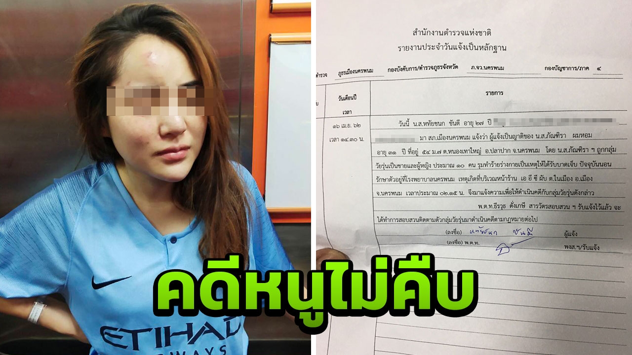 เมื่อวันที่ 19 พ.ค.62 ผู้สื่อข่าวรายงานว่า ที่มีหญิงสาว อายุ 31 ปี นำภาพหลักฐานรวมถึงคลิปภาพเหตุการณ์ขณะถูกทำร้ายร่างกาย จนได้รับบาดเจ็บสาหัส เมื่อวันที่ 15 เม.ย.ที่ผ่านมา เวลาประมาณ 02.15 น. บริเวณด้านหน้าผับชื่อดังแห่งหนึ่ง ในเขตเทศบาลเมืองนครพนม จนได้รับบาดเจ็บสาหัส นำตัวส่งไปรักษาที่โรงพยาบาลนครพนม ต้องพักรักษาตัวนานเกือบ 10 วัน เนื่องจากมีกลุ่มวัยรุ่นเป็นหญิง รวมถึงสาวประเภทสอง นับ 10 คน รุมทำร้ายไม่ยั้งมือ ทั้งเตะต่อย รุมกระทืบซ้ำ และใช้มือดึงผมโขกกับพื้นจนหมดสติ ก่อนมีคนมาช่วยเหลือนำส่งโรงพยาบาลนครพนม โดยจากการตรวจสอบภายหลังทราบชื่อผู้เสียหาย คือ น.ส.ภัณฑิรา ผมหอม อายุ 31 ปี ชาว ต.หนองเทา อ.ปลาปาก จ.นครพนม