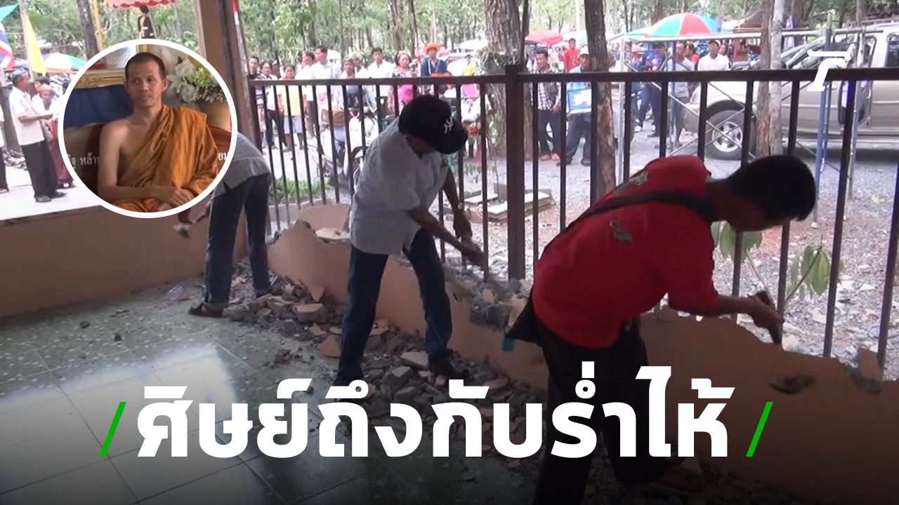 โดยหลังจากทำพิธีขอขมาเสร็จ พระอาจารย์ชัยชนะ ก็ให้บรรดาลูกศิษย์และชาวบ้านช่วยกันทุบทำลายอาคาร สิ่งปลูกสร้างต่างๆ ภายในวัด โดยใช้ค้อนปอนด์ทุบผนังคอนกรีตของตัวอาคาร โดยมีศิษยานุศิษย์พากันสวดมนต์แผ่เมตตาและขอขมาสิ่งศักดิ์สิทธิ์ตลอดขณะทำการรื้อถอน บางคนก็ถึงกับกลั้นน้ำตาไว้ไม่อยู่ เนื่องจากพาครอบครัวมาทำบุญที่ศูนย์ปฏิบัติธรรมแห่งนี้เป็นประจำนานหลายปี