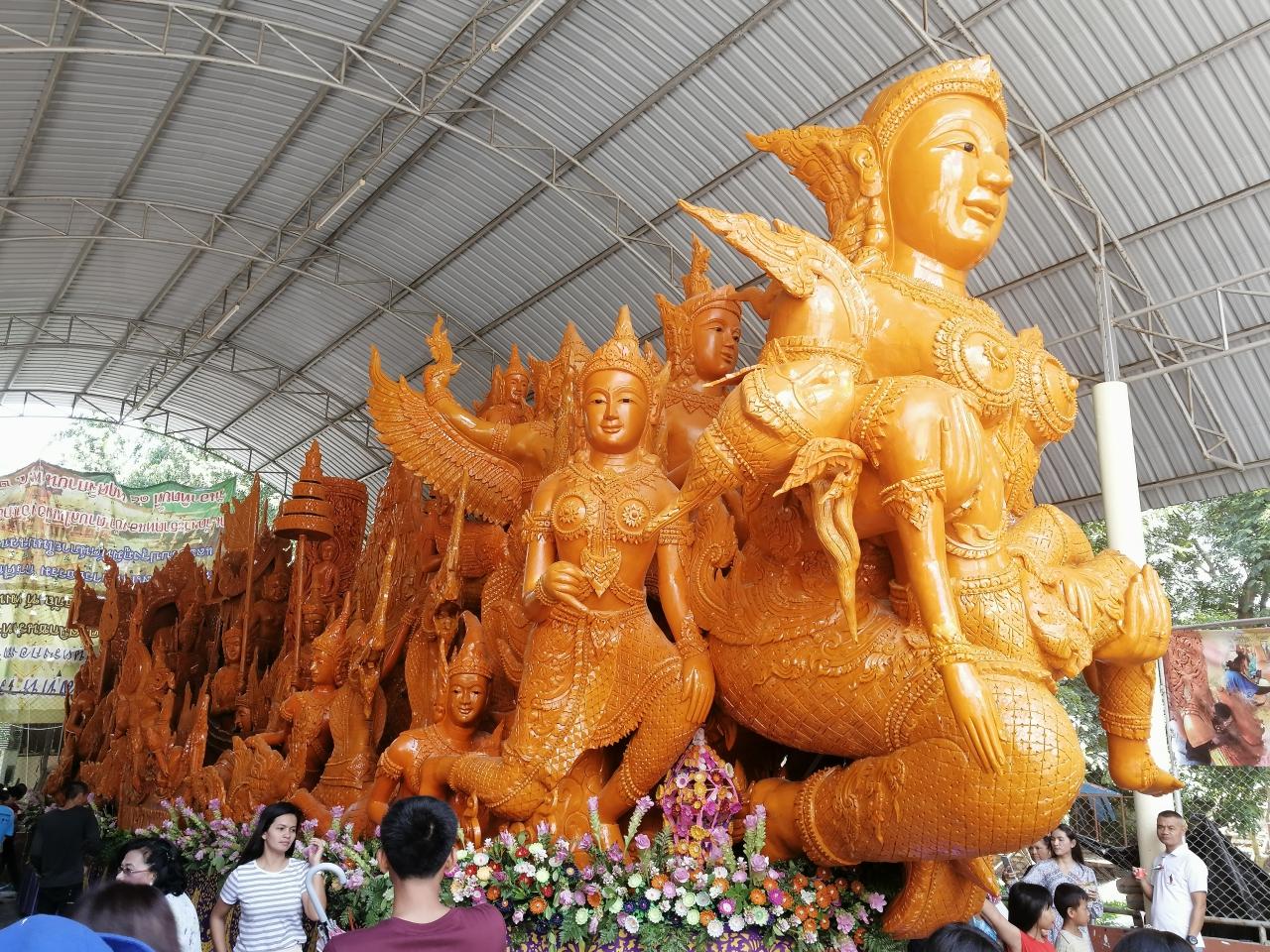 พุทธศาสนิกชน และนักท่องเที่ยว เดินทางมายังวัดพระธาตุหนองบัว เพื่อร่วมทำบุญ และชมความงามของต้นเทียน และขบวนรถแห่ ที่เตรียมไปประกวดพรุ่งนี้ (17 ก.ค.) บริเวณ รอบทุ่งศรีเมือง