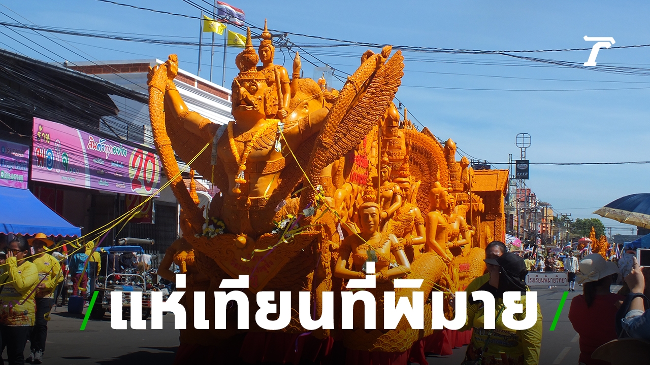 ชาวบ้านร่วมส่งขบวนแห่ต้นเทียนจากวัดต่างๆ ใน อ.พิมาย เต็ม 2 ข้างทาง โดยปีนี้ต้นขบวนต้นเทียนวัดเดิม ไม่ได้ร่วมประกวด แต่อีก 4 วัดส่งประกวด หลังจากแห่เสร็จในพิมาย ก็จะไปประกวดในตัวเมืองต่อไป