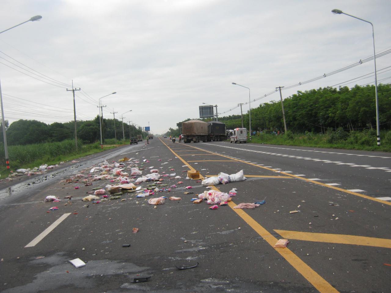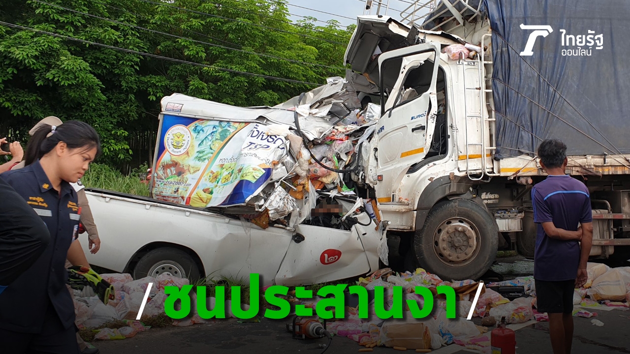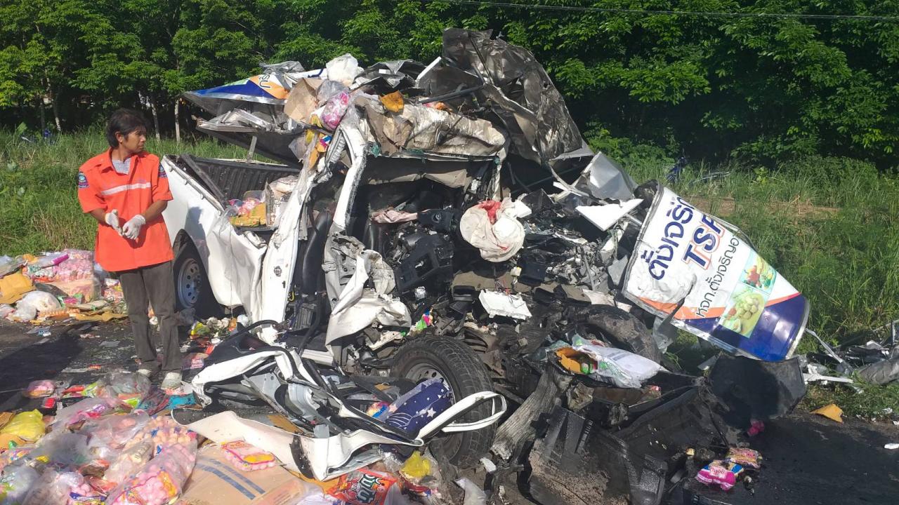 กระบะบรรทุกอาหารทะเลเต็มคันเสียหลักวิ่งข้ามเลน ชนประสานงารถพ่วง 22 ล้ออย่างจังห้องเครื่องยนต์แตก พ่วงลากยาว 100 เมตร คนขับปิกอัพพร้อมคนนั่งข้างคนขับถูกอัดก๊อบปี้ตายสยองคาที่ อาหารทะเลตกเกลื่อนถนน ส่วนโชเฟอร์พ่วงบาดเจ็บสาหัส...