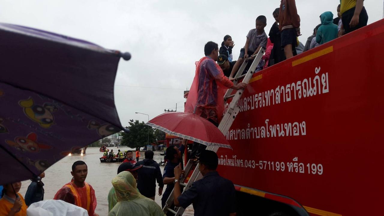 จนท.ร้อยเอ็ด สามารถช่วยอพยพเด็กนักเรียนอนุบาลกว่า 500 คน รวมทั้งชาวบ้าน คนชรา ผู้ป่วย ที่อยู่ริมน้ำอีก 100 คนที่ อ.โพนทอง หลังน้ำยังล้นตลิ่งไหลท่วมสูงกว่า 1 เมตร ไปยังที่ปลอดภัยได้ทั้งหมด