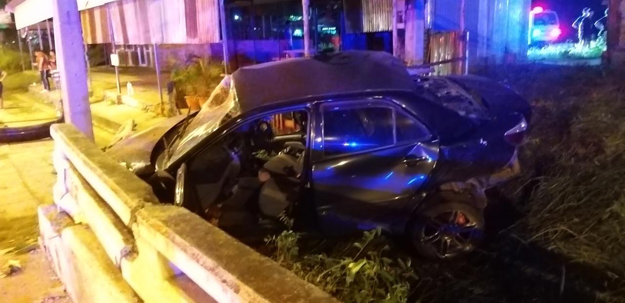 พ่อค้านมขับเก๋งพาเมียกลับบ้าน ยางระเบิดเสียหลักชนราวสะพาน รถพังยับดับสลด เมียบาดเจ็บ เหตุเกิดที่ทางหลวงแผ่นดินสาย 228 ใกล้ปากทางเข้า บขส.หนองบัวลำภู