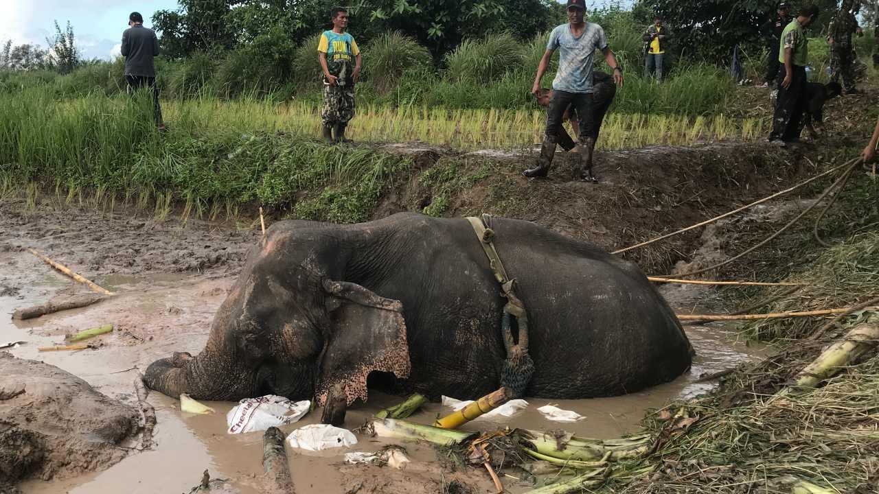 ช้างป่าเพศเมียจากเทือกเขาภูพาน ลงมาหากินใกล้หมู่บ้านที่สกลนคร เกิดติดหล่มขึ้นไม่ได้ ชาวบ้านแจ้งเจ้าหน้าที่อุทยานฯ ระดมกำลังกว่า 30 คน จนสุดท้ายทั้งดึงทั้งดัน จนช้างน้ำหนัก 4 ตันลุกขึ้นได้แล้ว