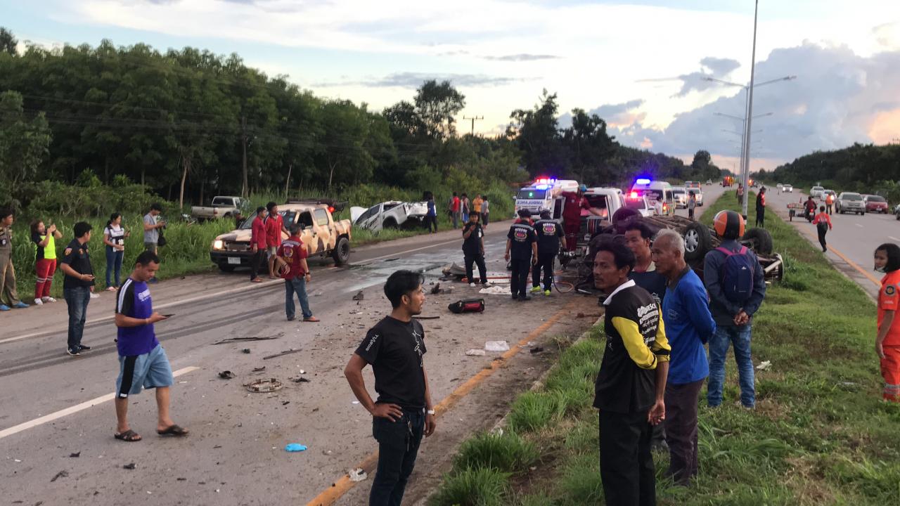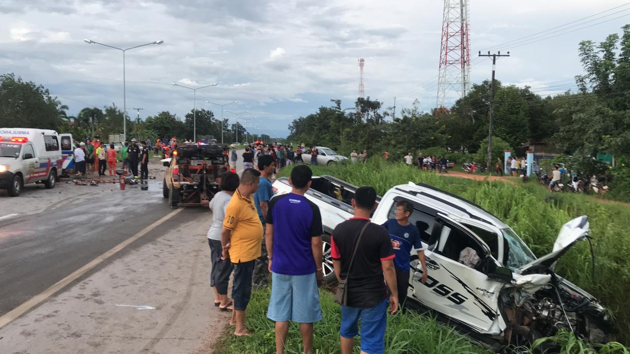 ที่เกิดเหตุพบรถยนต์กระบะ ยี่ห้ออีซูซุ สีแดง หมายเลขทะเบียน บง 6636 หนองคาย สภาพบิดงอ พังยับเยินทั้งคันพลิกคว่ำอยู่บนเกาะกลางถนน คนขับทราบชื่อต่อมาคือนายสุกัน พุทธวงศ์ อายุ 58 ปีได้รับบาดเจ็บสาหัสอยู่ภายในรถ พบนางอุสา พุทธวงศ์ อายุ 56 ภรรยาเสียชีวิตติดอยู่ภายในแค็บ และพบนางเพ็ญสินธ์ เทพา อายุ 53 ปี เป็นญาติที่โดยสารมาในรถ เสียชีวิตอยู่เบาะด้านหน้าข้างคนขับ ทั้งหมดอยู่บ้านเลขที่ 80 หมู่ 1 บ้านหนองกุ้งใต้ ต.กุดบง อ.โพนพิสัย จ.หนองคาย ใกล้กันรถพบรถกระบะสี่ประตู ยี่ห้ออีซูซุ รุ่น V – Coss สีขาว หมายเลขทะเบียน กษ 5945 อุดรธานี ตกลงร่องข้างถนน สภาพด้านหน้าพังยับเยิน มีคนขับทราบชื่อต่อมาคือนายธีระยุทธ์ แสงศรี อายุ 38 ปี อยู่บ้านเลขที่ 93 หมู่ 9 ต.รัตนวาปี อ.รัตนวาปี จ.หนองคาย เป็นคนขับ และมีผู้หญิง(ไม่ทราบชื่อ) นั่งมาด้วยได้รับบาดเจ็บ และมีวัยรุ่นหญิงผู้ขับขี่รถจักรยานยนต์ได้รับบาดเจ็บอีก 1 ราย เจ้าหน้าที่กู้ภัยและกู้ชีพ จึงได้นำตัวผู้บาดเจ็บส่ง รพ.โพนพิสัย และ รพ.พิสัยเวช เพื่อทำการรักษาต่อไป พร้อมประสานไปยังงานป้องกันและบรรเทาสาธารณภัย เพื่อสนับสนุนรถดับเพลิงในการนำทรายมาดูดซับน้ำมันและฉีดล้างน้ำมันที่เรี่ยราดบนถนน
