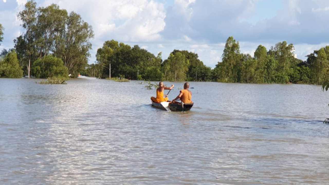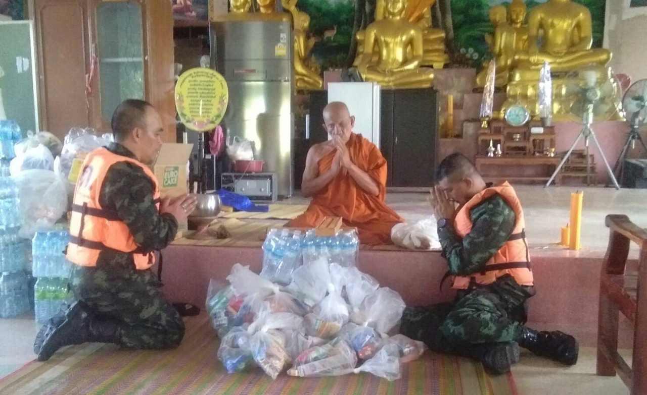พบพระสงฆ์และชาวบ้านหนีน้ำท่วมอพยพขึ้นไปอยู่บนศาลาวัดที่กำลังก่อสร้าง โดยมีพระสงฆ์ 3 รูป สามเณร 2 รูป และประชาชนที่ถูกน้ำท่วมบ้านจนมิดหลังคาเรือนอีกประมาณ 10 คน มาอาศัยอยู่รวมกัน มีเพียงเรือแจว 1 ลำไว้สัญจรออกมารับของบริจาคเข้าไปใช้ดำรงชีพ บางวันพระสงฆ์ต้องพายเรืออกมารับของบริจาคกลับวัดเอง ซึ่งทางเจ้าหน้าที่ทหารได้มอบข้าวสาร อาหารแห้ง น้ำดื่ม และจัดกำลังทหารพร้อมเรือแอร์โบ๊ตไปประจำไว้คอยดูแลเรื่องชีวิตประจำวันและความปลอดภัย