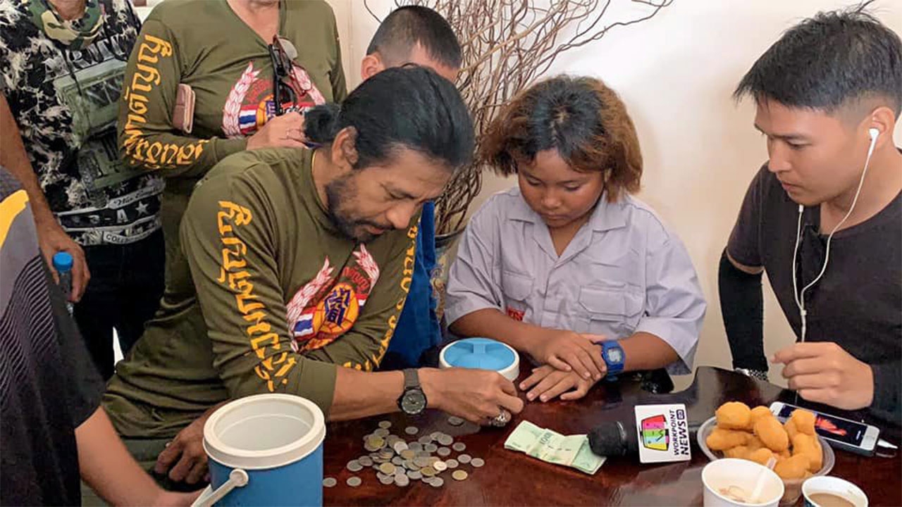 นายบิณฑ์ บรรลือฤทธิ์ พระเอกนักบุญ ช่วยนับธนบัตรและเหรียญ หลัง “น้องพิม” ด.ญ.สุภัสรา เข็มนางรอง ใส่เงินไว้ในกระติกน้ำ มารอที่ชั้นล่างในโรงแรมวิจิตรพร อ.วารินชำราบ จ.อุบลราชธานี เพื่อมอบเงินช่วยเหลือ นับเงินได้ 321 บาท ขณะที่ “บิณฑ์” ซึ้งใจแม้บ้านถูกน้ำท่วม ยังมีใจมาช่วย.