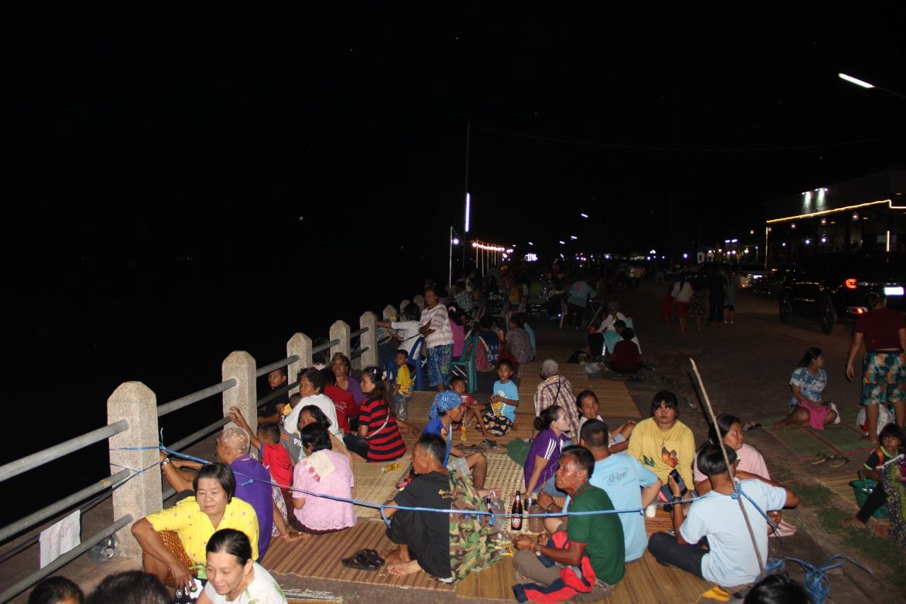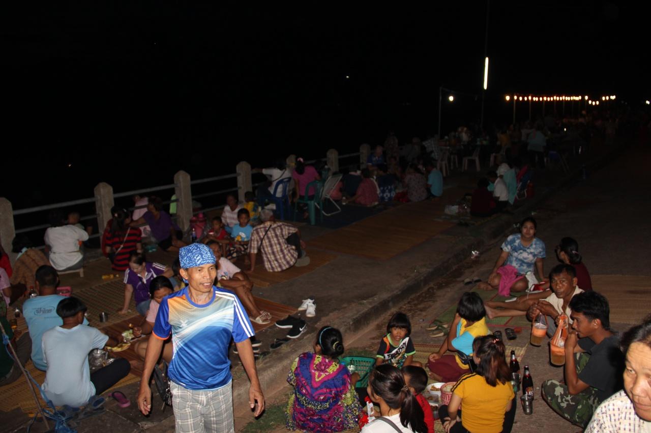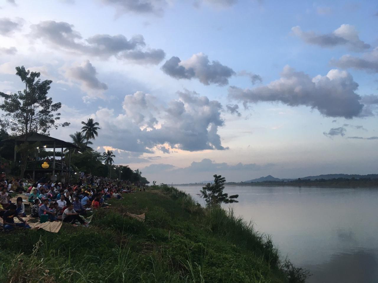 คนบึงกาฬ และนักท่องเที่ยวที่มารอเฝ้าตั้งแต่เย็น ได้เฮสนั่นแม่น้ำโขง เมื่อบั้งไฟพญานาค ลูกสีแดงอมชมพูผุดขึ้นจากน้ำโขงเป็นลูกแรก ที่บ้านท่าสีไค อ.บึงโขงหลง เมื่อเวลา 18.15 น.