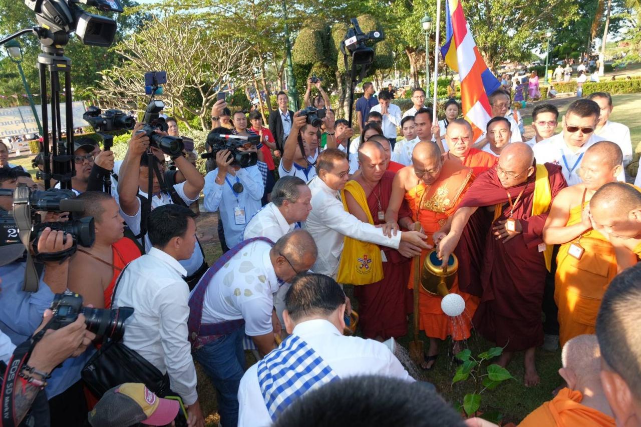 หลังจากนายชัยสมพร พรหมวิหาร ลั่นฆ้องเปิดงานอย่างเป็นทางการ และคณะธรรมยาตราได้ร่วมกันปลูกต้นพระศรีมหาโพธิจากอินเดียเป็นที่ระลึกแล้ว พระสงฆ์จาก 5 ประเทศและพระสงฆ์ในสปป.ลาวรวมแล้วกว่า 400 รูป ได้ออกบิณฑบาต เริ่มตั้งแต่ภายในวัดพระธาตุหลวง โดยมีชาว สปป.ลาว เกือบ 3 หมื่นแต่งกายด้วยชุดพื้นเมืองอันสวยงาม ร่วมใส่บาตรกันยาวเหยียดกว่า 3 กม. จนถึงกับทะลุออกนอกวัดที่ปกติก็กว้างใหญ่อยู่แล้ว ไปจนถึงสี่แยกหนองบอน ต่อเนื่องไปจนถึงอนุสาวรีย์แห่งชัยชนะ ถือเป็นปรากฏการณ์ในรอบหลายสิบปี ที่ปรากฏภาพเช่นนี้ออกมาให้เห็นในใจกลางนครหลวงเวียงจันทน์