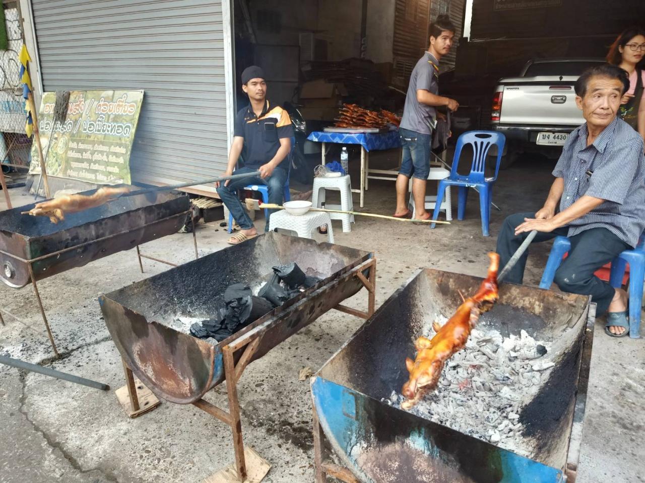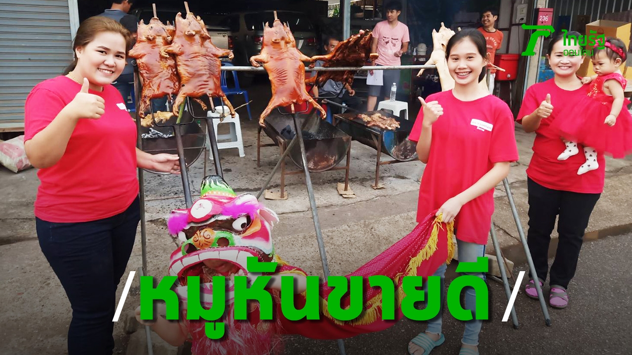 ส่วนที่บริเวณหน้าร้านวงศ์ทองดิจิตอล ถ.ประสาทชัย ต.บึงกาฬ อ.เมืองบึงกาฬ จ.บึงกาฬ พ่อค้าหมูหันจากแก่งกระเบา จ.มุกดาหาร ตั้งเตาถ่านนำหมูมาหัน ขายให้กับชาวไทยเชื้อสายจีนในพื้นที่และประชาชนทั่วไปที่สัญจรไปมา ซึ่งตัวเล็กขนาด 2-3 กิโลกรัม ขายในราคาตัวละ 1,300 บาท ส่วนตัวใหญ่ขายในราคาตัวละ 1,600 บาท ซึ่งก็ได้รับความสนใจเป็นอย่างมากมีลูกค้าสั่งจองมากกว่า 50 ตัว ซึ่งปกติแล้วต้องสั่งซื้อจากต่างจังหวัด นับเป็นปรากฏการณ์ใหม่ในพื้นที่บึงกาฬ ที่มีพ่อค้านำหมูมาหันขายแบบร้อนๆ ให้ชาวไทยเชื้อสายจีนนำไปไหว้ได้ทันที