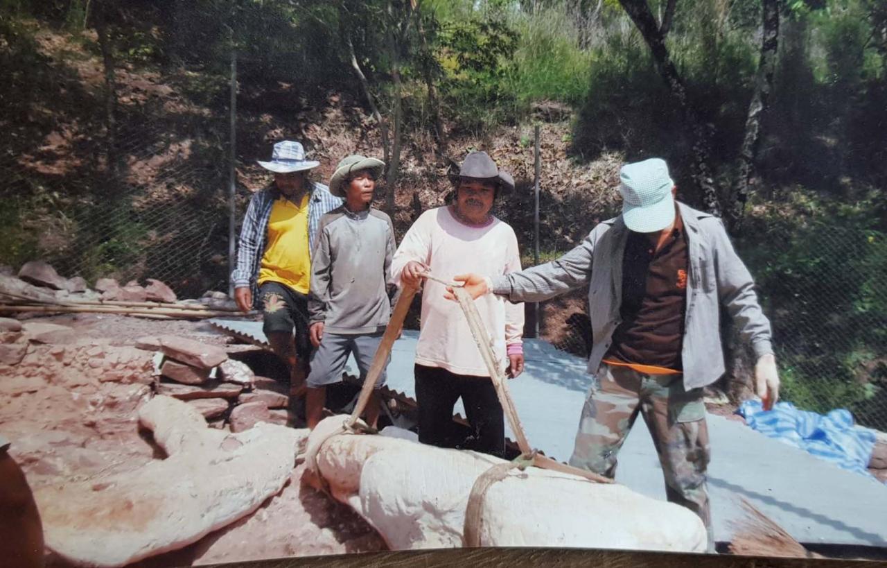 ส่วน นางแน่น พรมรินทร์ อายุ 52 ปี เจ้าของที่ดิน ที่มีการขุดพบซากไดโนเสาร์ กล่าวกับผู้สื่อข่าวว่า เมื่อปี 2549 พระสุบิน ขันติรโต เจ้าอาวาสวัดสวนป่าสายชล บ้านห้วยหินเกิ้ง ออกหาสมุนไพร แล้วไปขุดเจอซากกระดูกในที่ดินใกล้ๆ เนินหิน คิดว่าเป็นกระดูกช้าง จึงขุดมาไว้ที่วัด ต่อมาในปี 2550 มีพระลูกวัดที่มีความรู้ทางด้านธรณีวิทยา มาพบ จึงบอกกับชาวบ้านว่า กระดูกที่พบเป็นกระดูกไดโนเสาร์ จากนั้นจึงได้มีการประสานกับหน่วยงานที่เกี่ยวข้อง เพื่อลงมาสำรวจ ซึ่งก็มีคณะนักวิจัยจากกรมทรัพยากรธรณี ลงพื้นที่มาขุด และคณะก็เริ่มขุดตั้งแต่ปี 2550 จนถึงปี 2554 แล้วก็นำซากไดโนเสาร์ที่ขุดได้จากหลุมดังกล่าวไปวิจัย แล้วไม่เอามาคืน มีเพียงการเดินทางมาดูที่หลุมขุดปีละ 1 ครั้ง แต่ไม่มีคำตอบที่ชัดเจน บอกเพียงว่าถ้ามีความปลอดภัย จะนำมาคืนให้