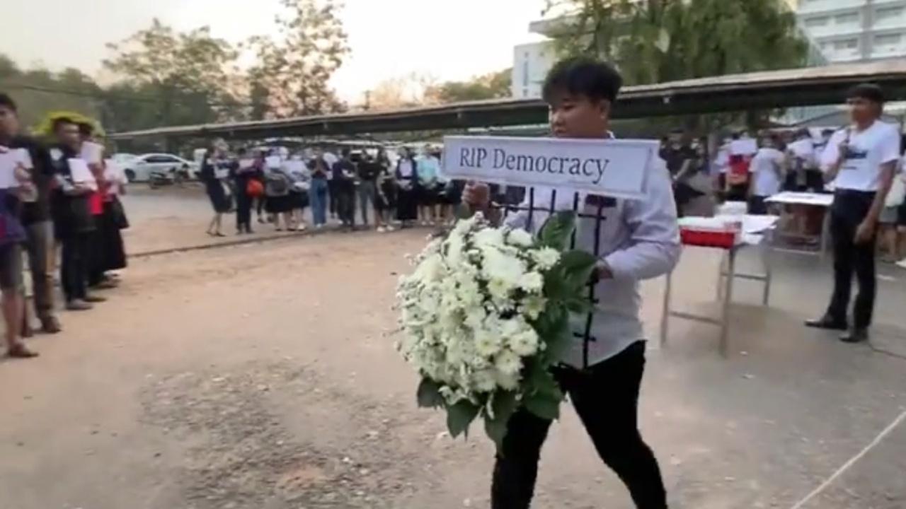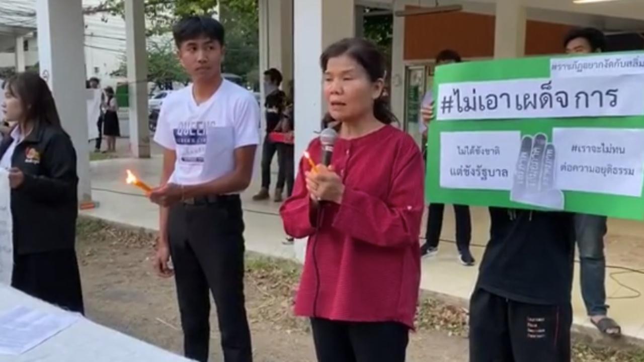 เมื่อเวลา 18.00 น. วันที่ 26 ก.พ.63 ที่หลังห้องประชุมคณะนิติศาสตร์ มหาวิทยาลัยราชภัฏมหาสารคาม กลุ่มนักศึกษาคณะรัฐศาสตร์ กว่า 100 คน เข้าร่วมกิจกรรม “ราชภัฏอยากงัดกับสลิ่ม” มีการร่วมกันเขียนแผ่นป้ายในเชิงสัญลักษณ์เกี่ยวกับการบริหารงานที่ไม่มีประสิทธิภาพของรัฐบาล พล.อ.ประยุทธ์ พร้อมวางพวงหรีด จุดเทียนไว้อาลัยให้แก่ความยุติธรรมในประเทศไทย