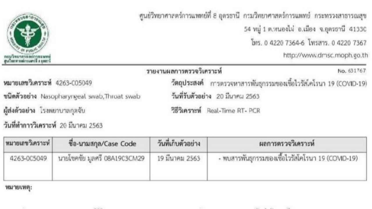 ล่าสุด ผลการตรวจศูนย์วิทยาศาสตร์การแพทย์ที่ 8 อุดรธานี กรมวิทยาศาสตร์การแพทย์ กระทรวงสาธารณสุข ของ ส.ต.อ.โชคชัย แจ้งผลเมื่อเวลา 20.00 น. วันที่ 20 มีนาคม 2563 ผลเป็นบวก พบสารพันธุกรรมของเชื้อไวรัสโคโรนา(COVID-19) โรงพยาบาลกุดจับได้ ส่งตัวไปรักษาที่ ศูนย์ควบคุมโรคโรงพยาบาลศูนย์อุดรธานี เบื้องต้น สภ.กุดจับ ได้ประสานข้อมูลและแจ้งข้อมูลนายอำเภอกุดจับ ผอ.รพ.กุดจับ หัวหน้าสาธารณสุขกุดจับ แจ้งข้อมูล ผบก.ภ.จว.อุดรธานี แจ้งข้าราชการตำรวจ สภ.กุดจับ ทราบข้อมูลเพื่อระวังป้องกันการติดเชื้อ และประสานข้อมูลกับ ผกก.สายตรวจ 191 บชน.โดยต่อเนื่อง แต่ยังไม่มีการแถลงข่าว จากศูนย์ปฏิบัติการณ์ตอบโต้ภาวะฉุกเฉิน สาธารณสุข จ.อุดรธานี แต่อย่างใด