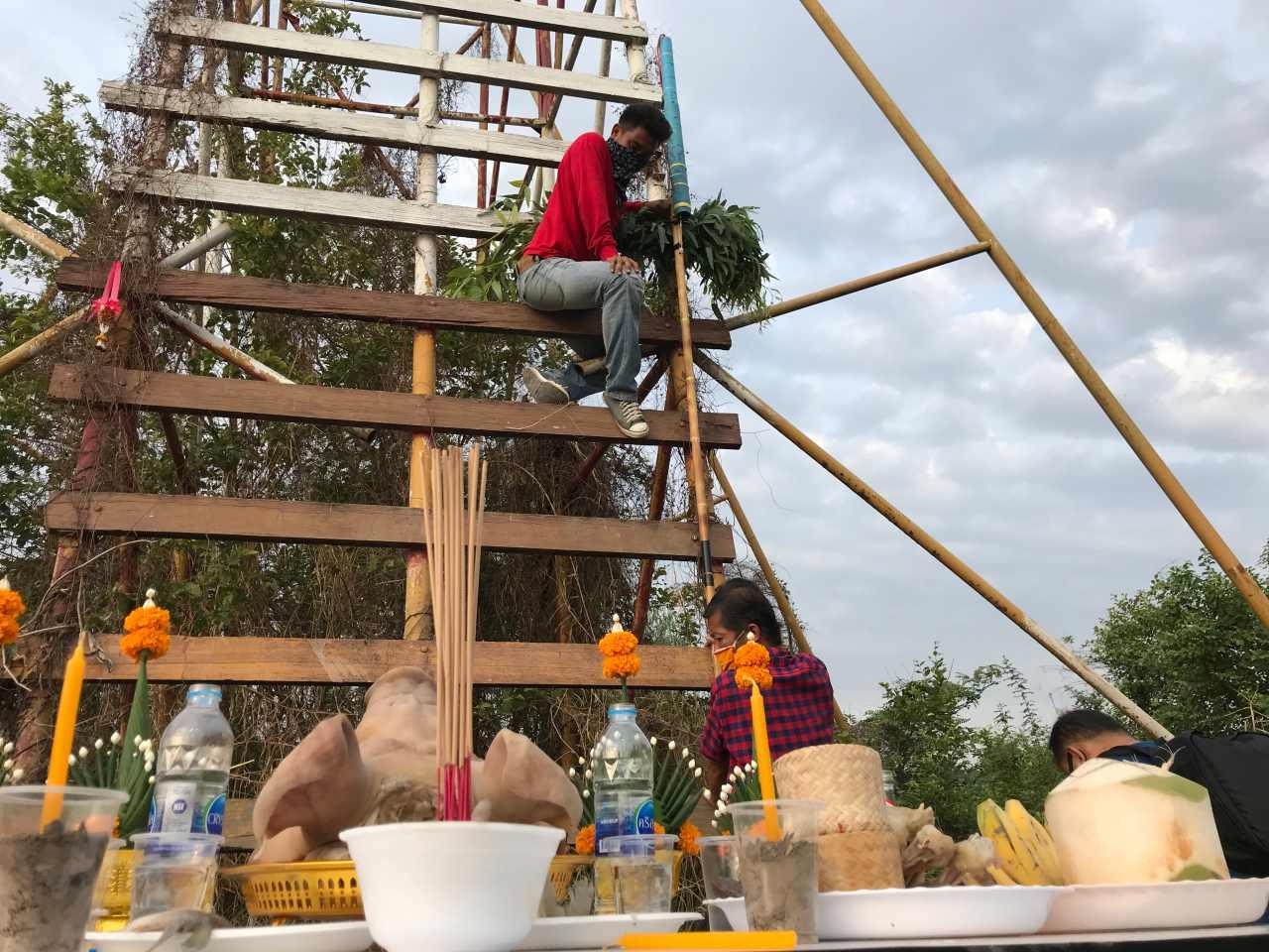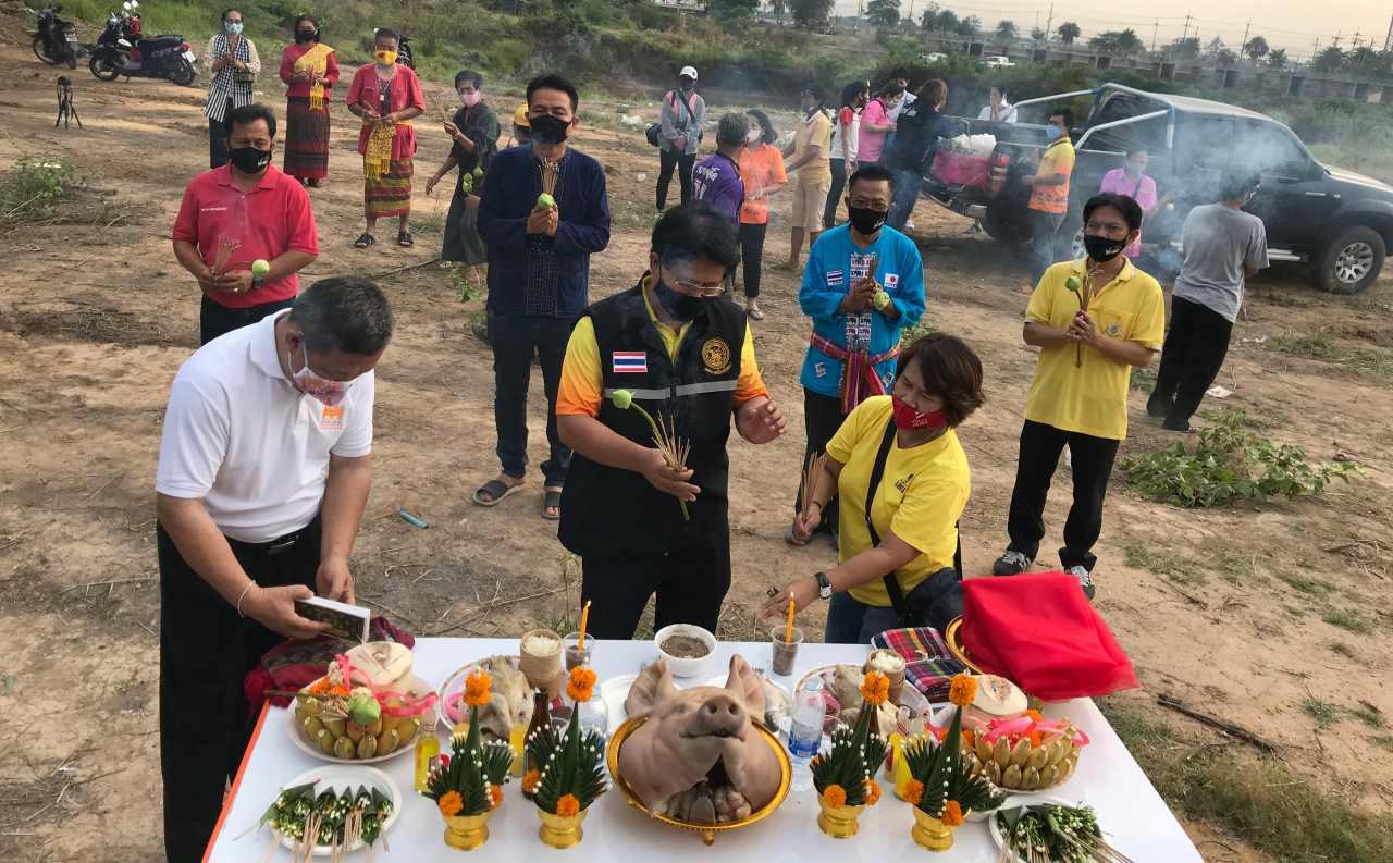 นายเทอดศักดิ์ ยุพฤทธิ์ รองนายกเทศมนตรีเทศบาลเมืองยโสธร พร้อมด้วย นายเริงศักดิ์ ทองแก้ว ประธานสภาเทศบาลเมืองยโสธร นายสมพงษ์ อยู่คง ประธานชมรมอนุรักษ์มรดกยโสธร เจ้าหน้าที่เทศบาลเมืองยโสธร และประชาชนประมาณ 20 ราย ร่วมกันนำเครื่องเซ่นไหว้ ดอกไม้ธูปเทียน หมากพลู หัวหมู และสุราขาว ไปทำพิธีบวงสรวงบอกล่าวสิ่งศักดิ์สิทธิ์เจ้าที่เจ้าทาง ว่า