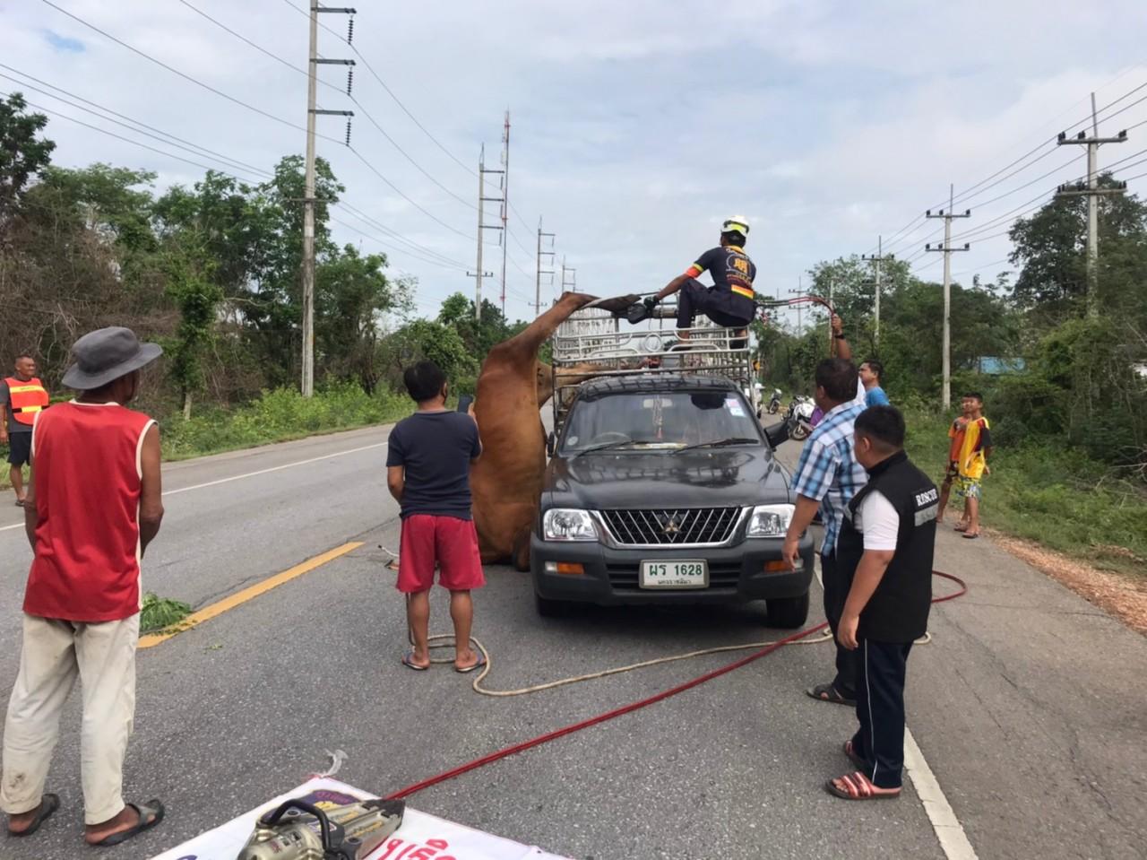 เจ้าของวัว กล่าวว่า เมื่อช่วงเช้าที่ผ่านมา ตนได้มาซื้อวัวที่บ้านหนองหญ้ารังกา เพื่อที่จะไปเลี้ยงต่อที่บ้าน จนกระทั่งนำวัวขึ้นรถระหว่างเดินทาง แม่วัวเกิดตกใจกระโดดลงรถ แต่พลาดท่าขาไปติดกับโครงเหล็กทั้ง 2 ข้าง ลำตัวห้อยลงถึงพื้นถนน ตนทั้งตกใจและสงสารกลัววัวเจ็บ เพราะยิ่งดิ้นทำให้ขาหักได้ จึงโทรขอความช่วยเหลือจากอาสากู้ภัย เร่งช่วยด่วน