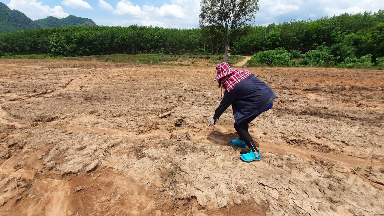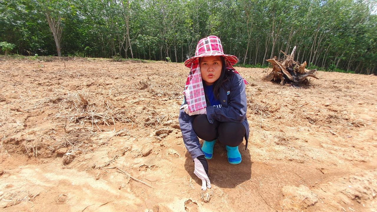 นางสาวอาดลีน พาไปดูยังพื้นที่ในไร่ที่มีการไถที่เตรียมปลูกแมคคาเดเมีย เพื่อไปดูรอยเท้าดังกล่าว โดยจาการสังเกตเบื้องต้นพบว่า รอยเท้าเป็นเท้าเดียวอยู่ที่พื้นดิน เป็นแนวตรงจำนวนนับ 10 รอยเท้า มีขนาดใหญ่ประมาณ 3x3 นิ้ว มีนิ้วเท้าคล้าย กีบเท้าหมี ระยะห่างรอยเท้าประมาณ 50 ซม. มาจากตีนภูสวนยางมาทางสระน้ำเป็นรอยเท้าแนวตรง ระยะทางกว่า 100 เมตร ดูแล้วไม่น่าใช่สัตว์ 4 เท้า หรือ 2 เท้า เพราะรอยเท้าเป็นแนวตรง เหมือนลักษณะก้าวกระโดดขาเดียว แต่ถ้าเป็นสัตว์ 4 เท้าหรือ 2 เท้า จะต้องมีรอยเท้าที่เหยียบพื้นดินลักษณะเดิน ซ้าย ขวา แต่เป็นเป็นรอยเท้าเดี่ยวๆ และเป็นแนวตรง และมีทั้งรอยเท้าเล็กใหญ่อยู่ติดกันเป็นบางจุด เหมือนมีสัตว์ 2 ตัว แต่มีขาดเดียว ไม่น่าใช่สัตว์ 4 เท้า หรือ 2 เท้า แน่นอน