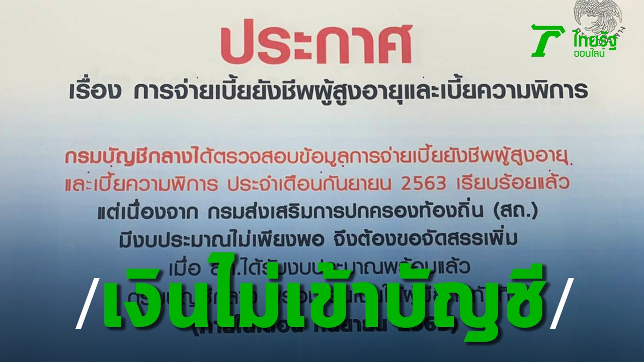 "ประกาศ เรื่องการจ่ายเบี้ยยังชีพผู้สูงอายุและเบี้ยความพิการ กรมบัญชีกลางได้ตรวจสอบข้อมูลการจ่ายเบี้ยยังชีพผู้สูงอายุและเบี้ยความพิการ ประจำเดือนกันยายน 2563 เรียบร้อยแล้ว แต่เนื่องจาก กรมส่งเสริมการปกครองท้องถิ่น (สถ.) มีงบประมาณไม่เพียงพอ จึงต้องขอจัดสรรเพิ่ม เมื่อ สถ.ได้รับงบประมาณพร้อมแล้ว กรมบัญชีกลาง พร้อมโอนเงินให้ผู้มีสิทธิ์ทันที ภายในเดือนกันยายน 2563"