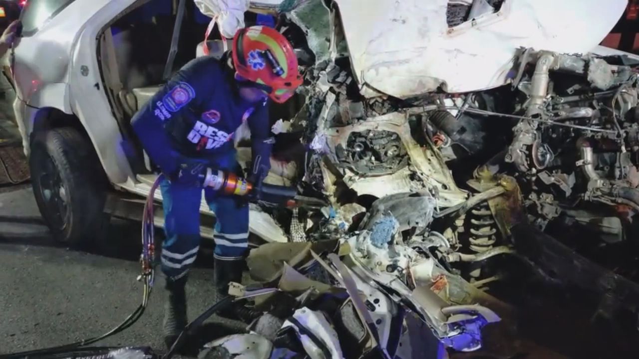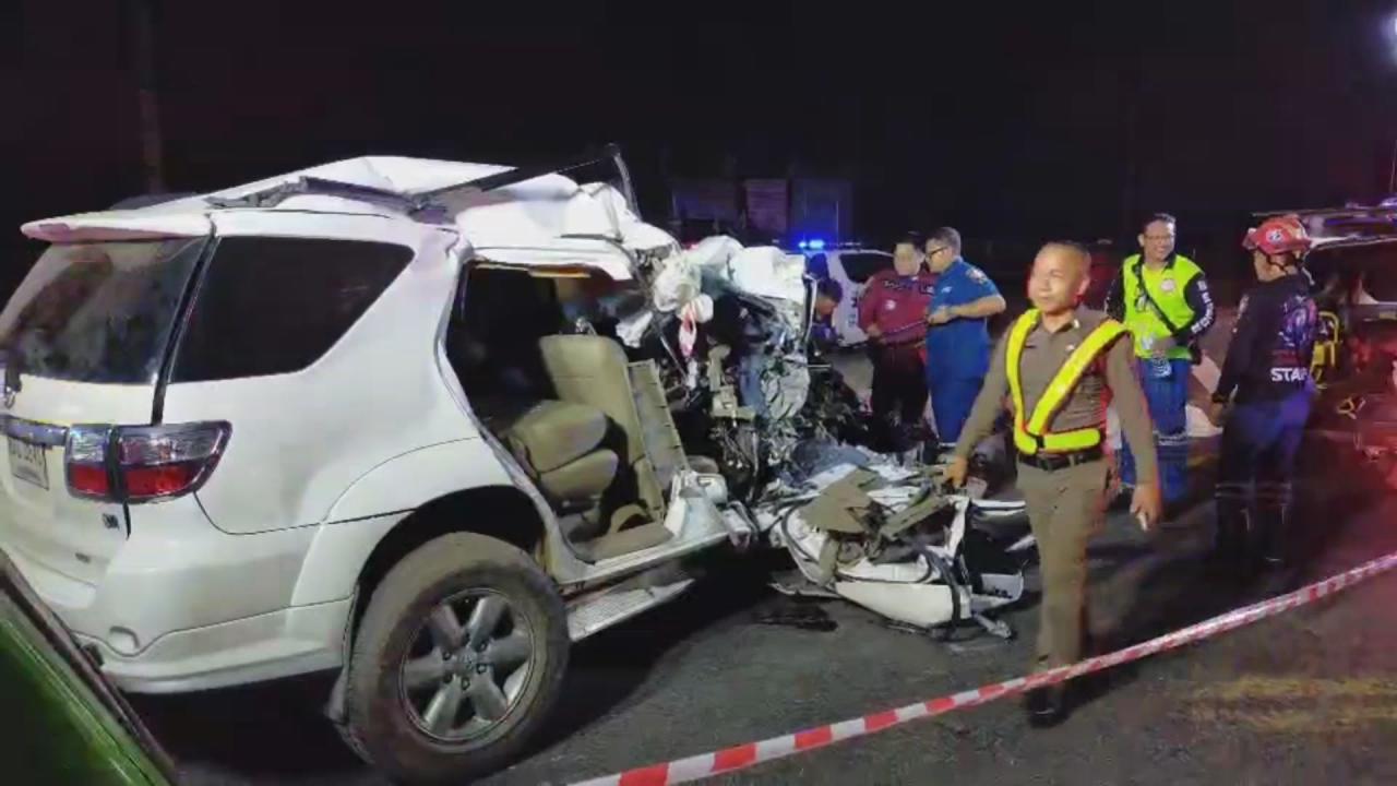 ตำรวจ ปส. ซิ่งฟอร์จูนเนอร์หลังออกเวรเพื่อกลับบ้านพัก เกิดหลับในเสียหลักหักหลบกะทันหันชนตอม่อสะพานลอย ถูกอัดก๊อบปี้ดับคารถ