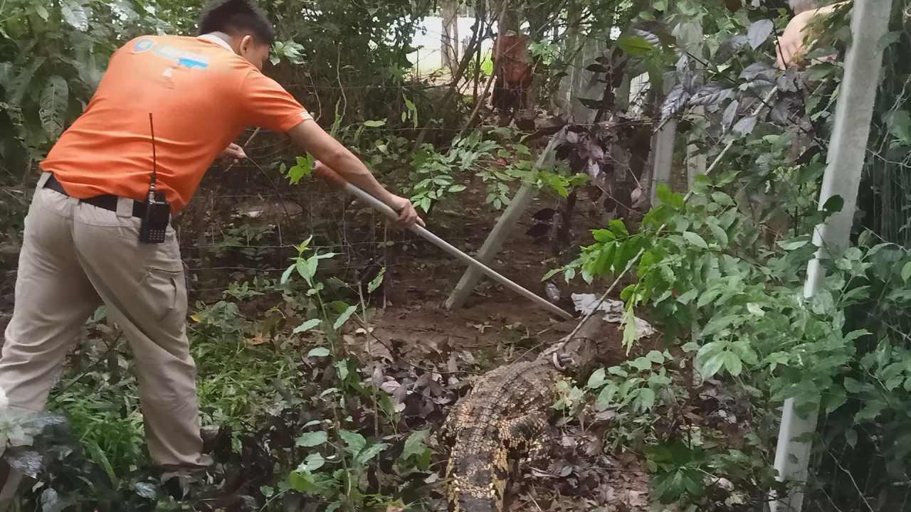 ที่เกิดเหตุพบอาสากู้ภัยฯ และชาวบ้าน ช่วยกันหาวิธีจับจระเข้ขนาดใหญ่ ความยาวประมาณ 3 เมตรเศษ น้ำหนักน่าจะไม่ต่ำกว่า 80 กิโลกรัม โดยใช้เวลา 1 ชั่วโมง จึงสามารถจับได้สำเร็จ เริ่มจากใช้เชือกทำเป็นบ่วงมัดปาก และลำคอ แล้วโยนผ้าปิดตาของมันไว้ จากนั้นใช้เชือกไนลอนลากตัวของมันออกมาในที่โล่ง ช่วยกันมัดขาทั้งสี่ข้างบริเวณใต้ต้นขนุน ใช้ชายฉกรรจ์ 5 คน ช่วยกันจับและหามออกมาใส่รถตู้ฉุกเฉินของมูลนิธิฯ แต่จระเข้ไม่ยอมขึ้นรถโดยง่าย พยายามดิ้นลงจากรถ เนื่องจากผ้าที่คลุมดวงตาออก ทำให้มันตกใจตามสัญชาตญาณ เมื่อเผชิญหน้ากับคนที่เข้ามาจับตัวหรือเข้าใกล้ ส่วนอาสากู้ภัยฯ ต่างพากันตกใจ เนื่องจากไม่เคยจับจระเข้ขนาดใหญ่ เคยจับแต่งูตัวเล็ก งูเหลือม และตัวเงินตัวทอง