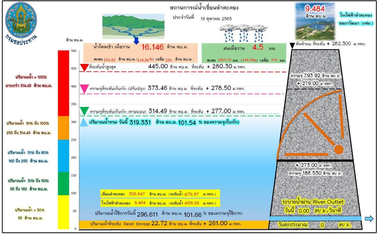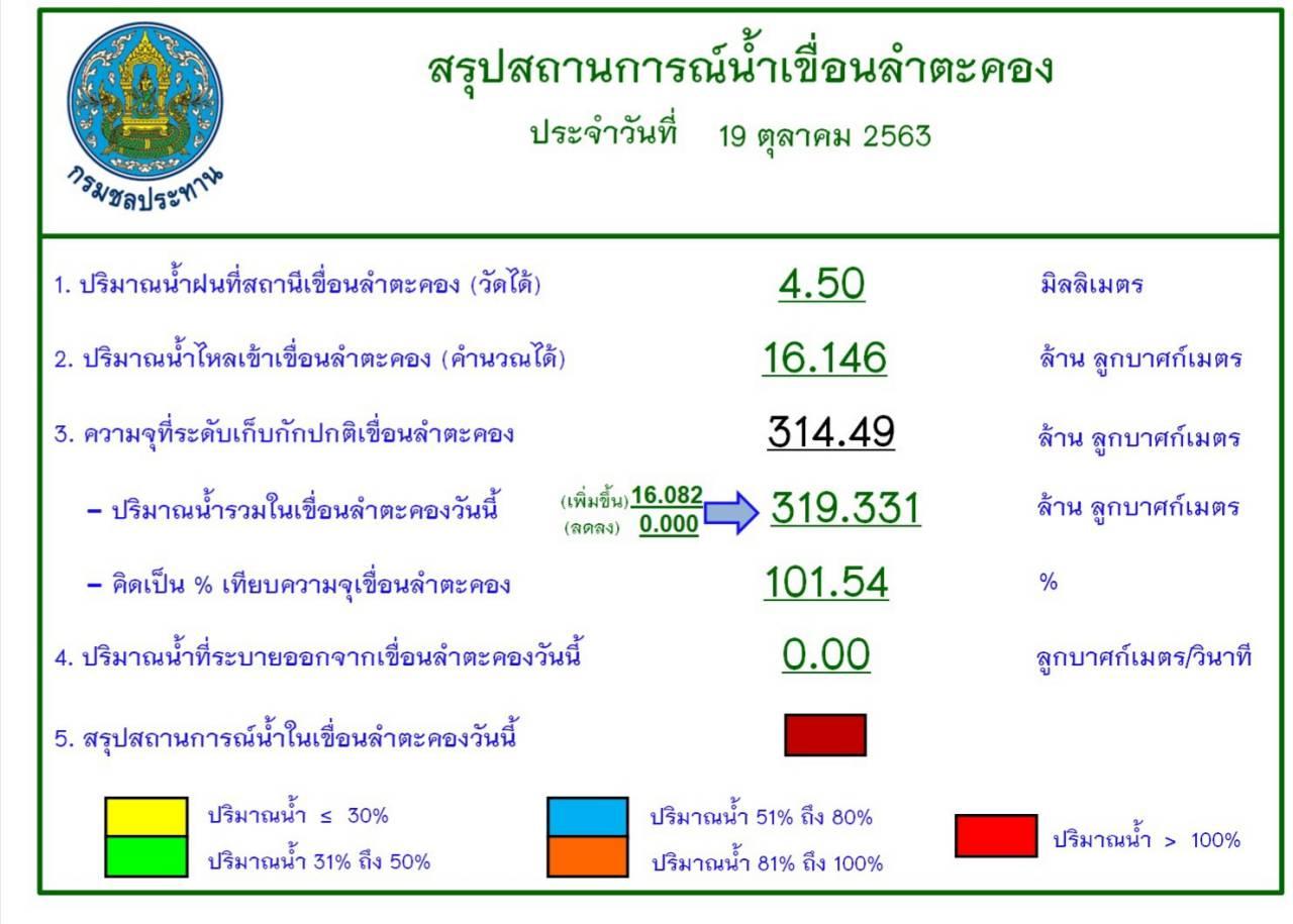 หลังจากล่าสุดสถานการณ์น้ำในเขื่อนลำตะคอง อำเภอสีคิ้ว จังหวัดนครราชสีมา มีปริมาณน้ำกักเก็บอยู่ที่ 319 ล้านลูกบาศก์เมตร คิดเป็นกว่า 101% ของความจุทั้งหมด 314 ล้านลูกบาศก์เมตร มีปริมาณน้ำไหลงอ่างเมื่อวานนี้ 16.15 ล้าน ลบ.ม. ทางเขื่อนยังไม่ระบายน้ำออก เนื่องจากพื้นที่ด้านล่างน้ำในลำน้ำลำตะคองยังมีปริมาณมาก ทั้งนี้ได้เตรียมความพร้อมกับทางโครงการบำรุงและรักษาลำตะคอง และสำนักงานชลประทานจังหวัดนครราชสีมา ในการระบายน้ำออกจากเขื่อนลำตะคองแล้ว คาดว่าภายใน 1-2 วันนี้ ทางเขื่อนจะทยอยระบายน้ำออก เพื่อไม่ให้กระทบกับชาวบ้านน้อยที่สุด