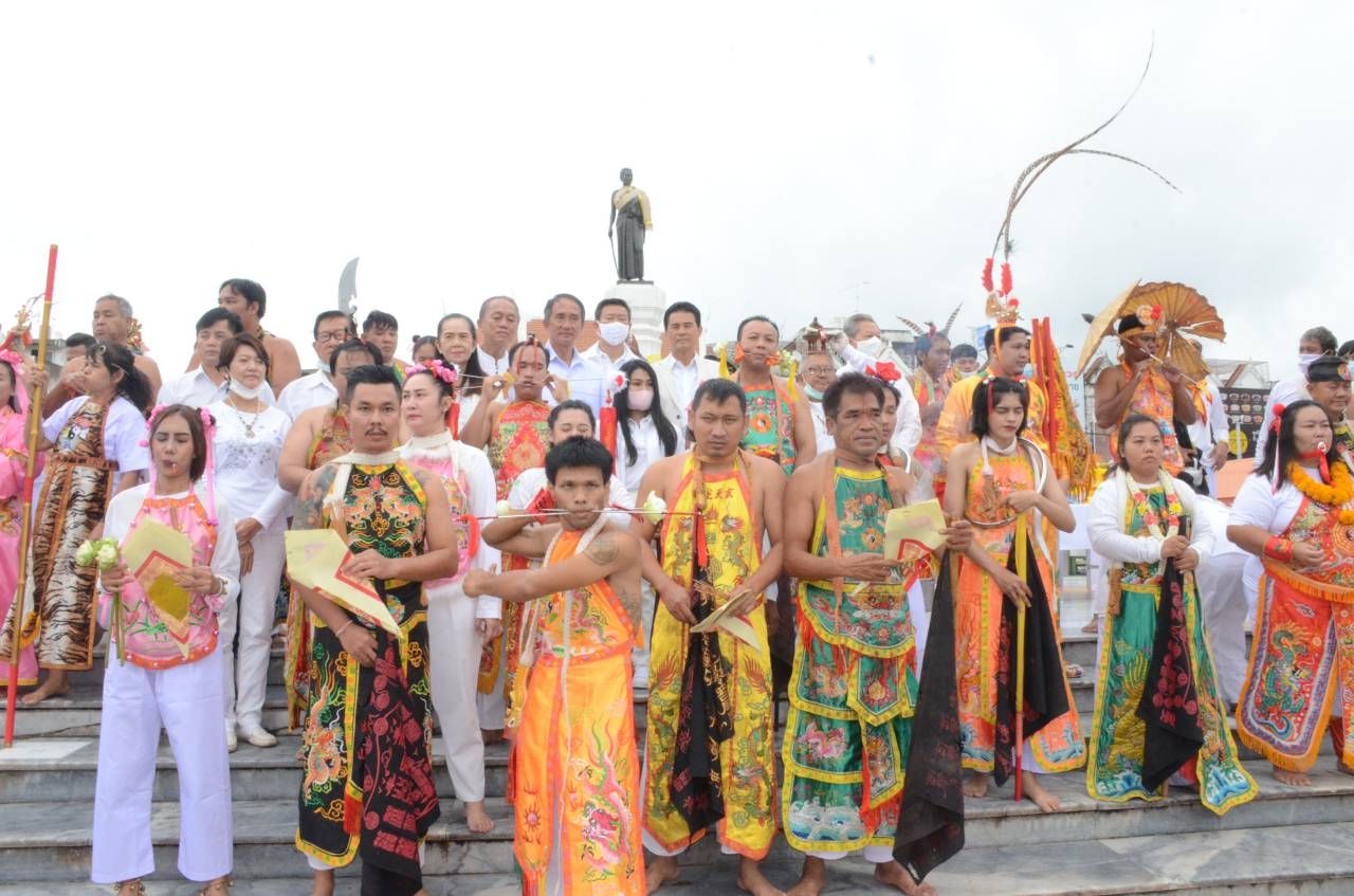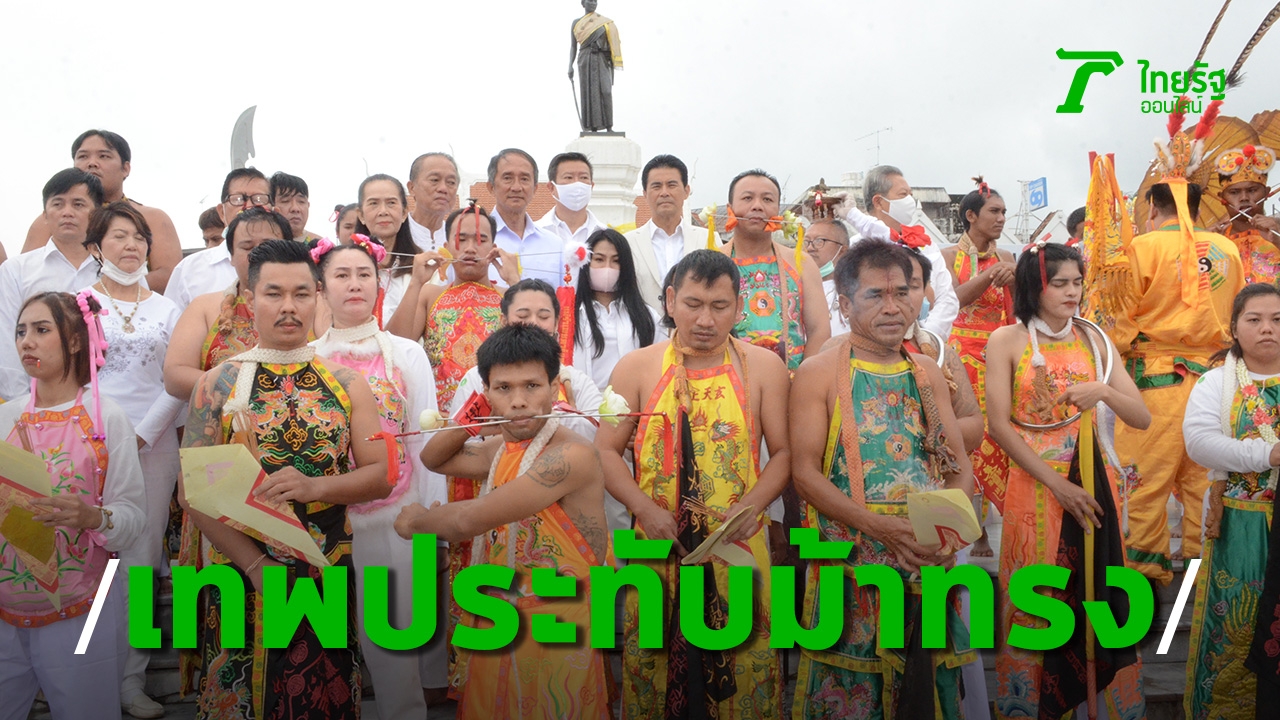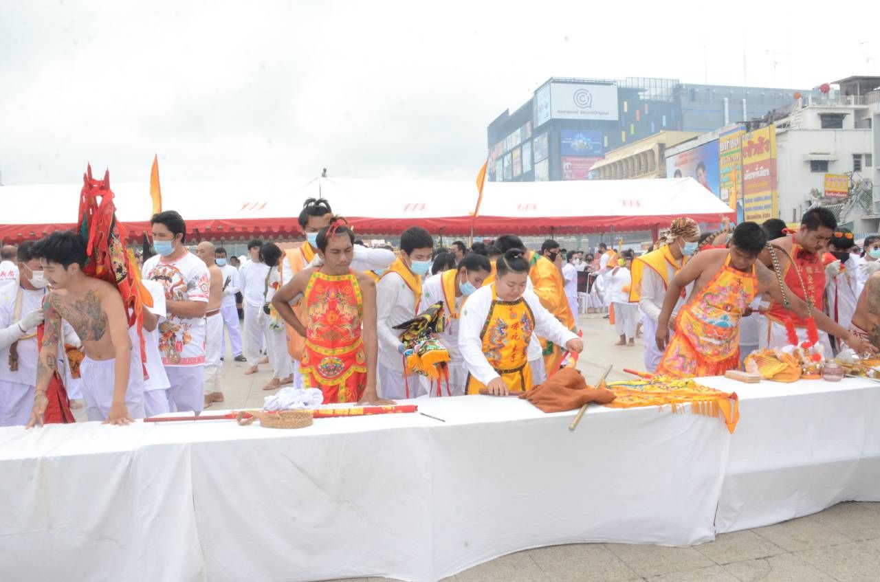 สำหรับพิธีอัญเชิญเทพเจ้าประทับทรงมีร่างทรง จำนวน 50 ร่าง ส่วนใหญ่จะเป็นชาย และมีผู้หญิงบางส่วน ร่วมด้วยการใช้เหล็กแหลม ดาบ กระบี่ทำด้วยสเตนเลส มีการล้างทำความสะอาดและเคลือบน้ำยาฆ่าเชื้อเพื่อป้องกันบาดทะยักหรือการติดเชื้อ ทิ่มแทงกระพุงแก้ม เชือดลิ้นตัวเอง พร้อมแห่รอบเมือง มีการจุดประทัด จำนวน 1 แสนดอก