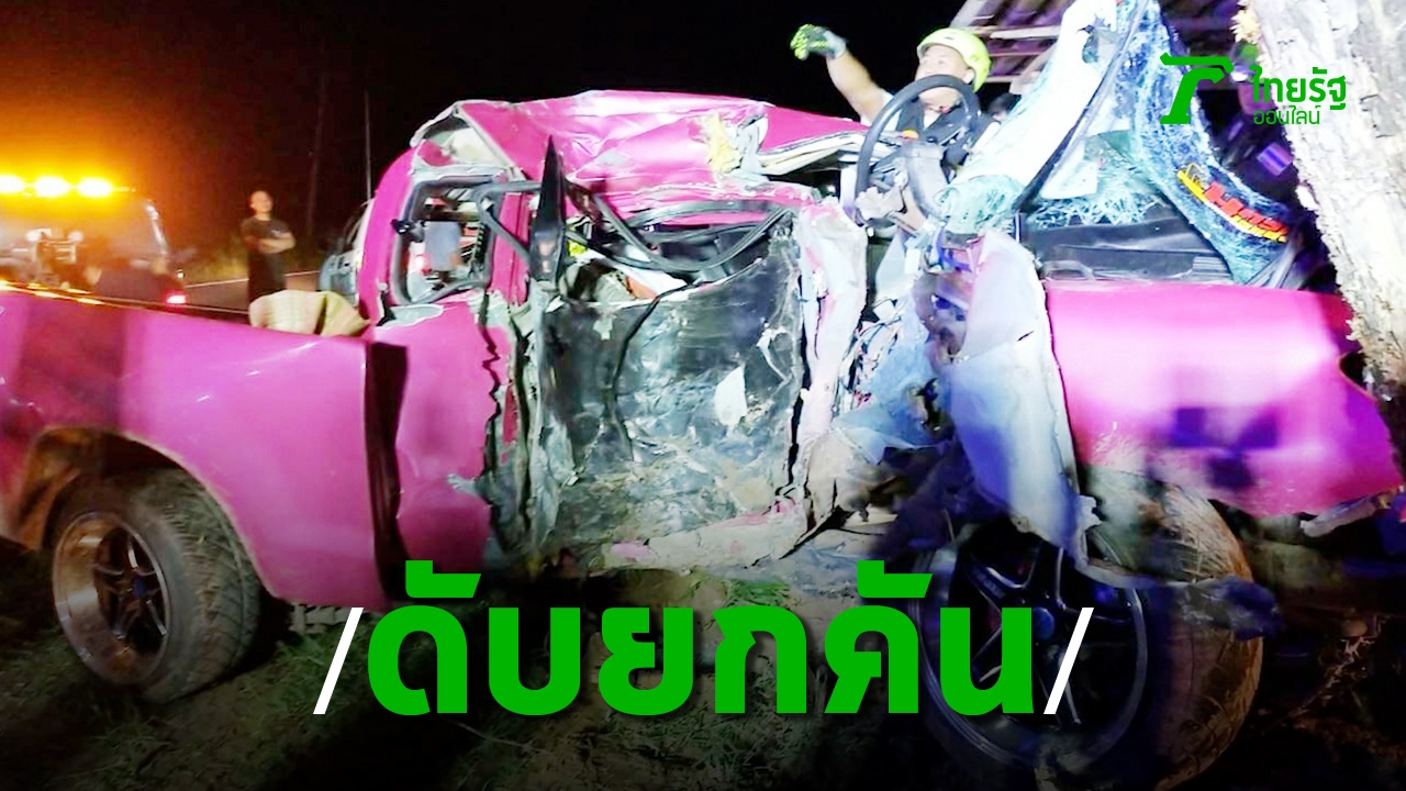 กระบะซิ่งมุ่งหน้า อ.ดงหลวง จ.มุกดาหาร ระหว่างทางเสียหลักลงข้างทาง พุ่งเสยต้นไม้ รถพังยับ คนขับ-คนนั่ง ตายคาซาก 3 ศพ